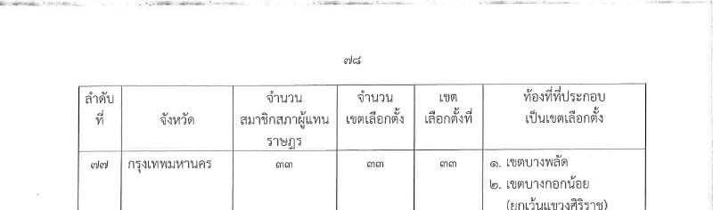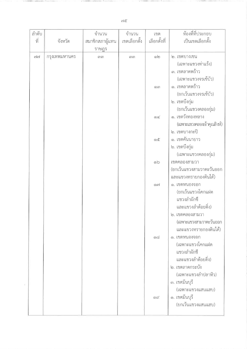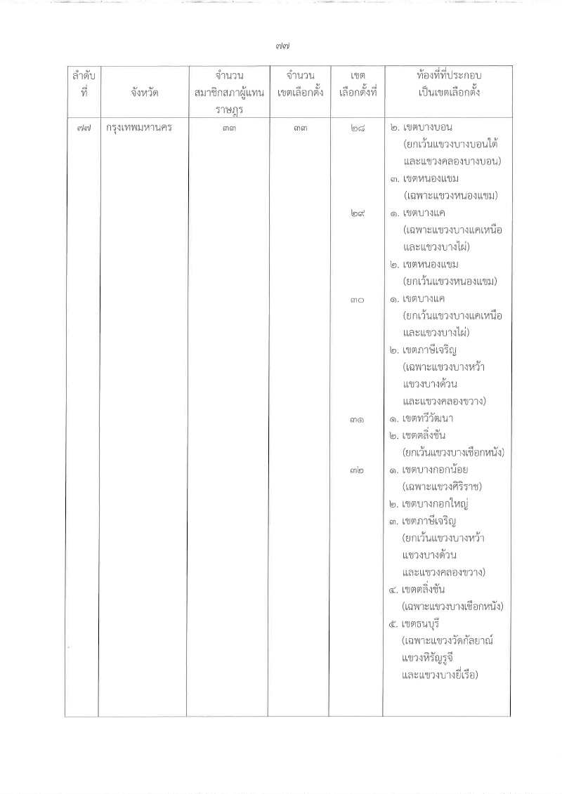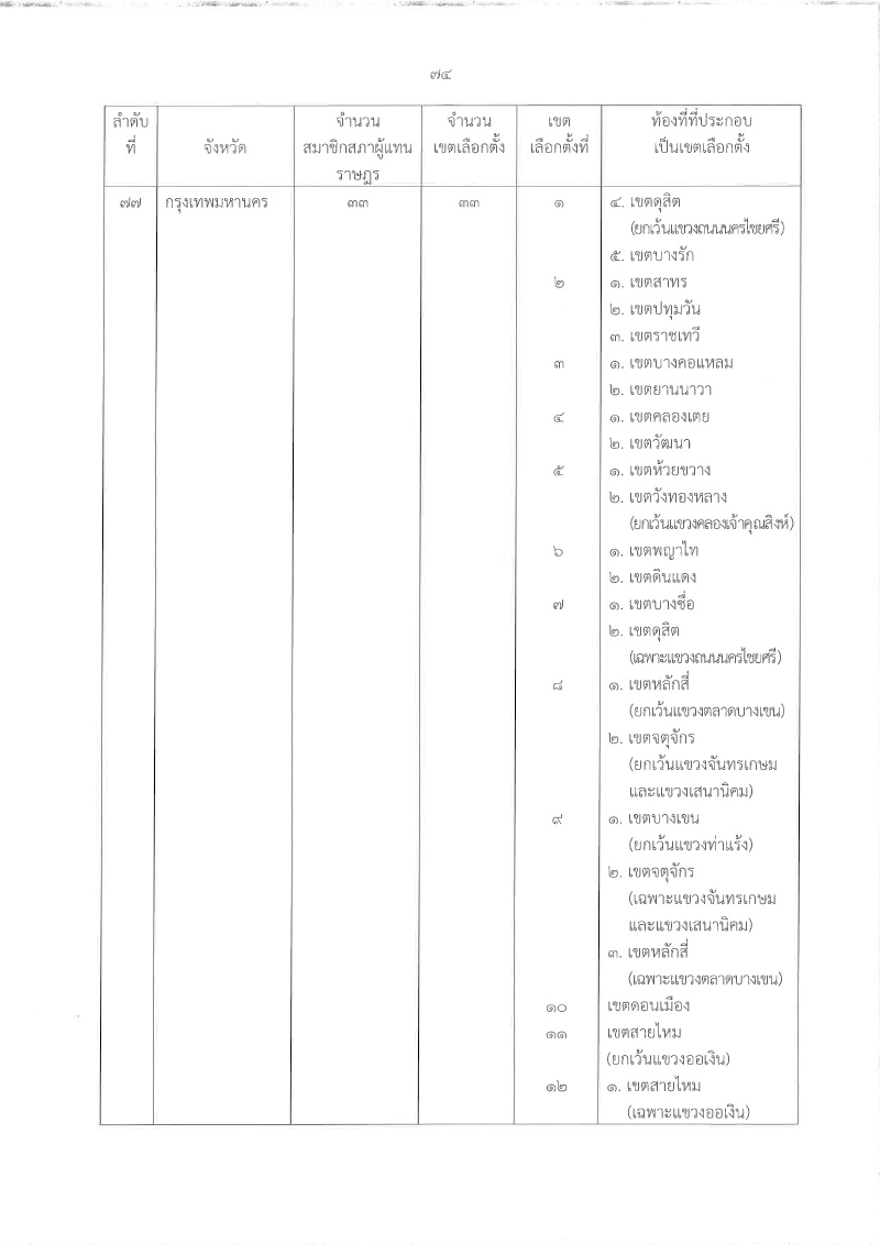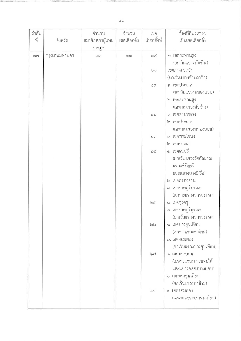 โดยกรุงเทพมหานคร (กทม.) แบ่งเขตเลือกตั้ง 33 เขต ดังนี