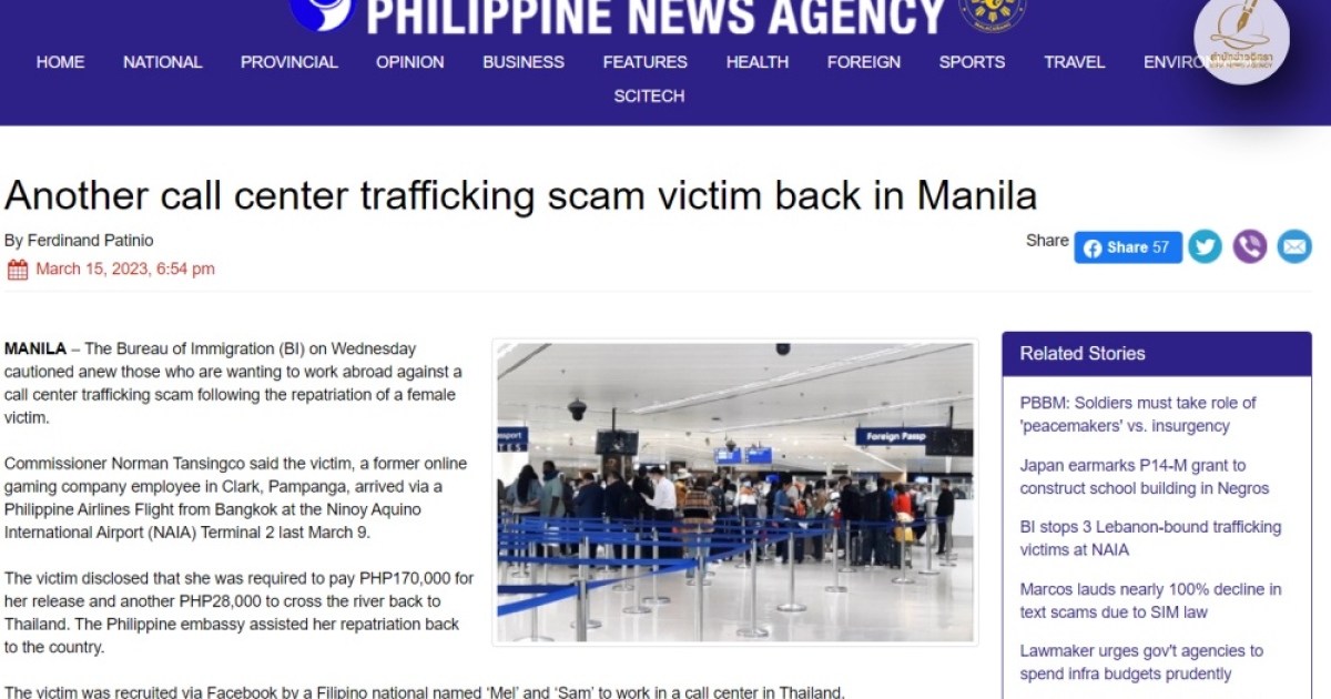 สำนักข่าวอิศรา (www.isranews.org) รายงานข่าวเกี่ยวกับขบวนการหลอกสมัครงานที่มีฐานอยู่ในภูมิภาคเอเชียตะวันออกเฉียงใต้หรือว่าอาเซียนและส่งผลกระทบต่อประเทศไทยว่าเมื่อวันที่ 15 มี.ค.ที่ผ่านมา สํานักงานตรวจคนเข้าเมือง (BI) ของประเทศฟิลิปปินส์มีการอกประกาศเตือนผู้ที่มีความต้องการไปทำงานต่างประเทศว่าให้เฝ้าระวังการหลอกลวงการค้ามนุษย์ผ่านกระบวนการคอลเซ็นเตอร์ หลังจากที่ก่อนหน้านี้ทางการฟิลิปปินส์สามารถจะช่วยเหยื่อที่เป็นผู้หญิงคนหนึ่งกลับประเทศได้เป็นผลสำเร็จ
