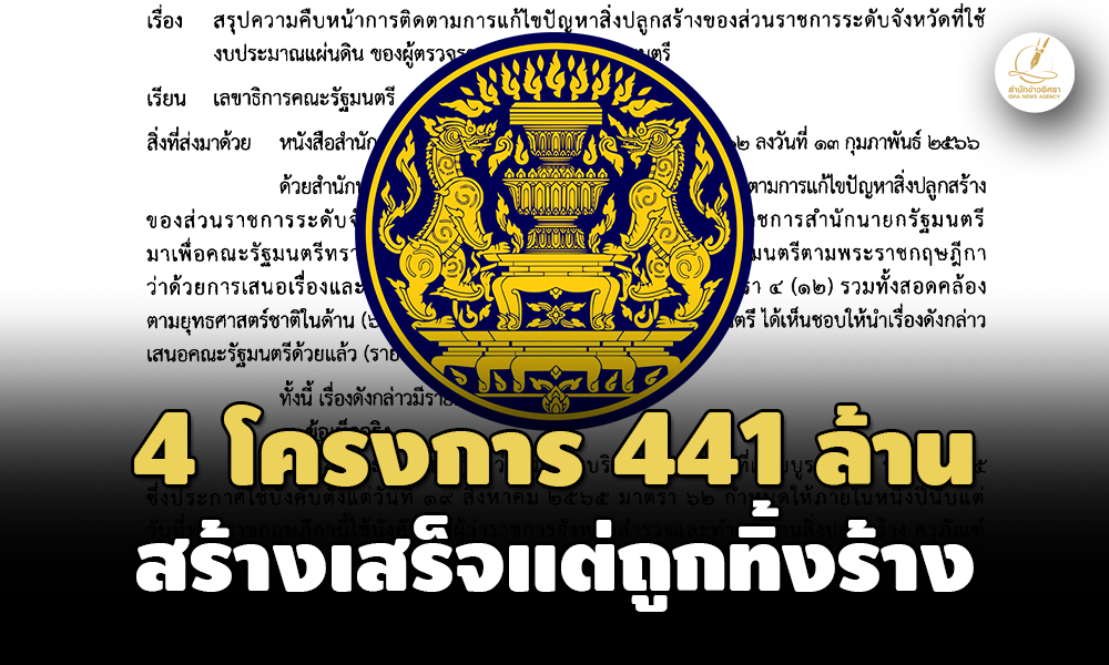 สำนักข่าวอิศรา (www.isranews.org) รายงานว่า ในการประชุมคณะรัฐมนตรี (ครม.) เมื่อวันที่ 14 มี.ค.ที่ผ่านมา สำนักงานปลัดสำนักนายกรัฐมนตรี (สปน.) ได้รายงานให้ที่ประชุม ครม. รับทราบความคืบหน้าการแก้ปัญหาสิ่งปลูกสร้างของส่วนราชการระดับจังหวัดที่ใช้งบประมาณแผ่นดินของผู้ตรวจราชการสำนักนายกรัฐมนตรี โดยรายงานดังกล่าว ผู้ตรวจราชการฯ พบว่า มีสิ่งปลูกสร้างที่ถูกทิ้งร้างหรือไม่ได้ใช้ประโยชน์อย่างน้อย 4 แห่ง วงเงินรวม 441.37 ล้านบาท ได้แก่