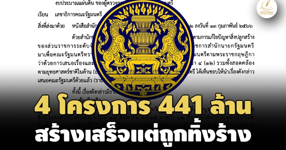 ครม.รับทราบรายงาน ‘ผู้ตรวจราชการสำนักนายกฯ’ พบว่าสิ่งปลูกสร้าง 4 โครงการ 441 ล้าน ถูกทิ้งร้าง แต่ได้หารือแนวทางแก้ไขแล้ว พร้อมระบุ 4 กลุ่มโครงการมีปัญหา ‘สร้างเสร็จแต่ไม่ได้ใช้งาน-ก่อสร้างล่าช้า’