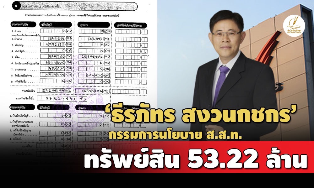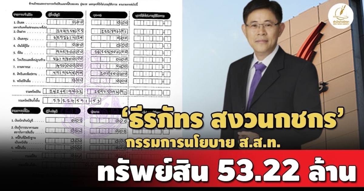 ป.ป.ช. เปิดบัญชีทรัพย์สิน 'ธีรภัทร สงวนกชกร' กรณีเข้ารับตำแหน่งกรรมการนโยบาย ส.ส.ท. ทรัพย์สินกว่า 53 ล้าน ลงทุนใน บ.ทรูคอร์ปอเรชั่น 1 ล. ภรรยามีที่ดินเขตราชเทวีมูลค่า 21 ล. รายได้ 6.4 ล้านต่อปี