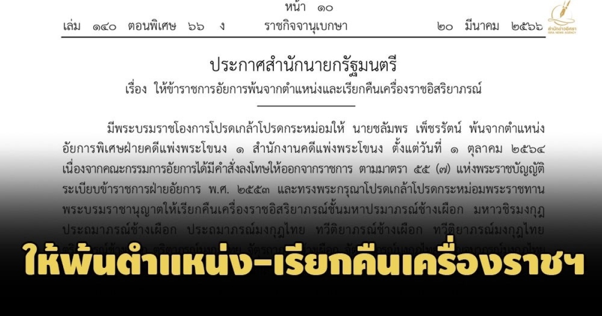 สำนักข่าวอิศรา (www.isranews.org) รายงานว่า เมื่อวันที่ 20 มี.ค. 2566 ราชกิจจานุเบกษา เผยแพร่ ประกาศสำนักนายกรัฐมนตรี เรื่อง ให้ข้าราชการอัยการพ้นจากตำแหน่งและเรียกคืนเครื่องราชอิสริยาภรณ์