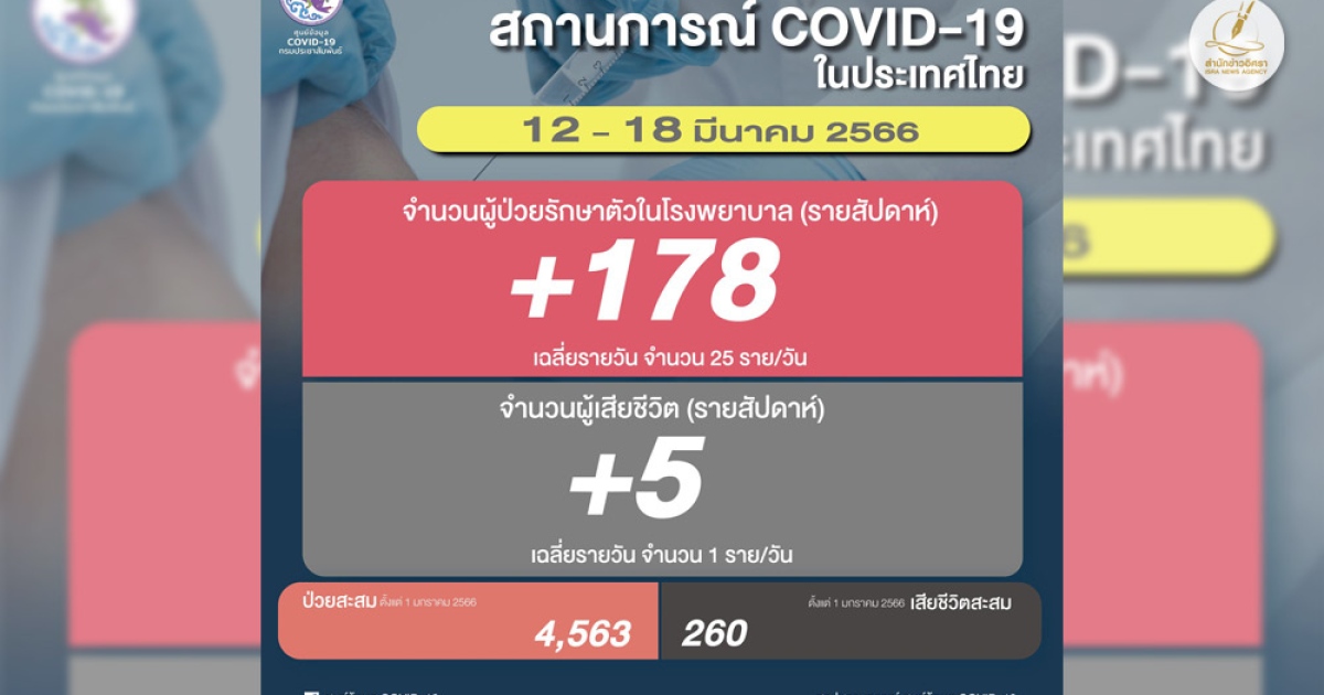สถานการณ์โควิดไทย สัปดาห์ล่าสุด 12 - 18 มี.ค. 2566 ติดเชื้อเข้ารักษาใน รพ.ใหม่ 178 ราย เฉลี่ย 25/วัน เสียชีวิต 5 ราย เฉลี่ย 1/วัน อาการหนัก 44 ราย
