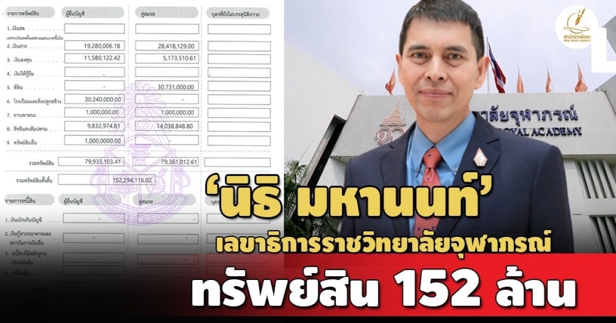 ป.ป.ช. เปิดบัญชีทรัพย์สิน 'นิธิ มหานนท์' เลขาธิการราชวิทยาลัยจุฬาภรณ์ ทรัพย์สิน 152 ล. มีบ้านมูลค่า 30 ล.ที่เขตคลองเตย กรุงเทพฯ รถ Benz 2 คัน สะสมหรียญทองคำพระพุทธโอสถ รายได้ 3.6 ล./ปี ภรรยามีที่ดินในเขตบางรัก และจอมทอง