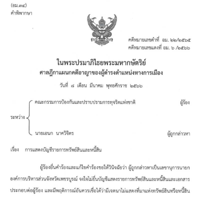 พิพากษาว่า ผู้ถูกกล่าวหาจงใจไม่ยื่นบัญชีแสดงรายการทรัพย์สินและหนี้สินต่อผู้ร้องและมีพฤติการณ์อันควรเชื่อได้ว่ามีเจตนาไม่แสดงที่มาแห่งทรัพย์สินหรือหนี้สิน กรณีพ้นจากตําแหน่งเลขานุการนายกองค์การบริหารส่วนจังหวัดเพชรบูรณ์ ตามพระราชบัญญัติประกอบรัฐธรรมนูญว่าด้วยการป้องกันและปราบปรามการทุจริต พ.ศ. 2561 มาตรา 114 วรรคสอง (1) ให้เพิกถอนสิทธิ สมัครรับเลือกตั้งของผู้ถูกกล่าวหาตลอดไป ตามพระราชบัญญัติประกอบรัฐธรรมนูญว่าด้วยการป้องกันและปราบปรามการทุจริต พ.ศ. 2561 มาตรา 81 วรรคหนึ่งและวรรคสอง กับมีความผิด ตามพระราชบัญญัติประกอบรัฐธรรมนูญว่าด้วยการป้องกันและปราบปรามการทุจริต พ.ศ. 2561 มาตรา 167 จําคุก 2 เดือน และปรับ 8,000 บาท ผู้ถูกกล่าวหาให้การรับสารภาพ เป็นประโยชน์แก่การพิจารณา มีเหตุบรรเทาโทษ ลดโทษให้กึ่งหนึ่ง ตามประมวลกฎหมายอาญา มาตรา 78 คงจําคุก 1 เดือน และปรับ 4,000 บาท ไม่ปรากฏว่าผู้ถูกกล่าวหาเคยได้รับโทษจําคุกมาก่อนโทษจําคุกจึงให้รอการลงโทษไว้มีกําหนด 1 ปี ตามประมวลกฎหมายอาญา มาตรา 56 ไม่ชําระ ค่าปรับให้จัดการตามประมวลกฎหมายอาญา มาตรา 29, 30 (คดีหมายเลขแดงที่ อม.6 /2566 วันที่ 8 มี.ค.2566)