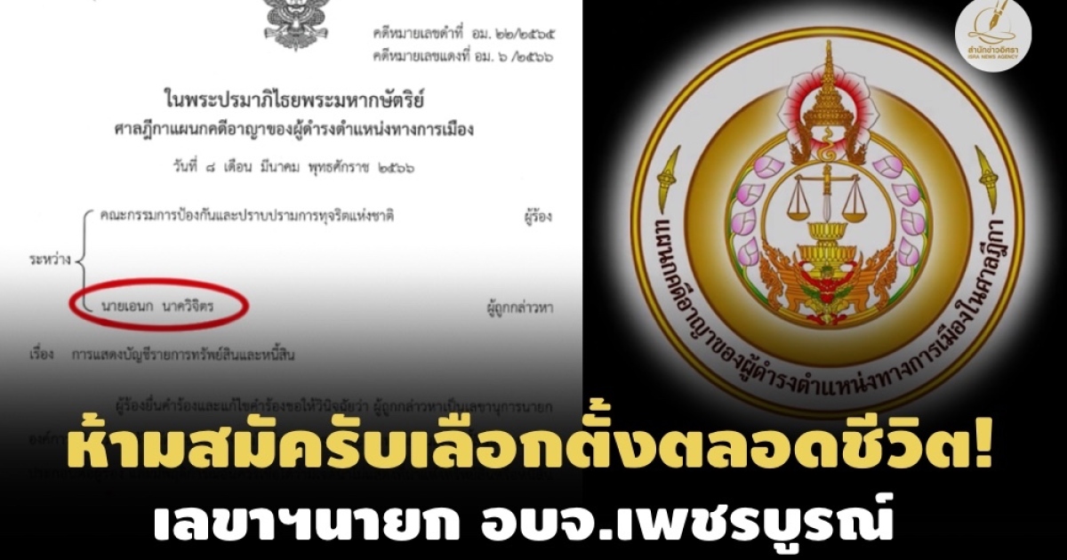 - ศาลฎีกาฯห้ามดำรงตำแหน่งการเมืองตลอดชีวิต นายก อบต.หนองปลิง ยื่นบัญชีฯเท็จ ป.ป.ช.