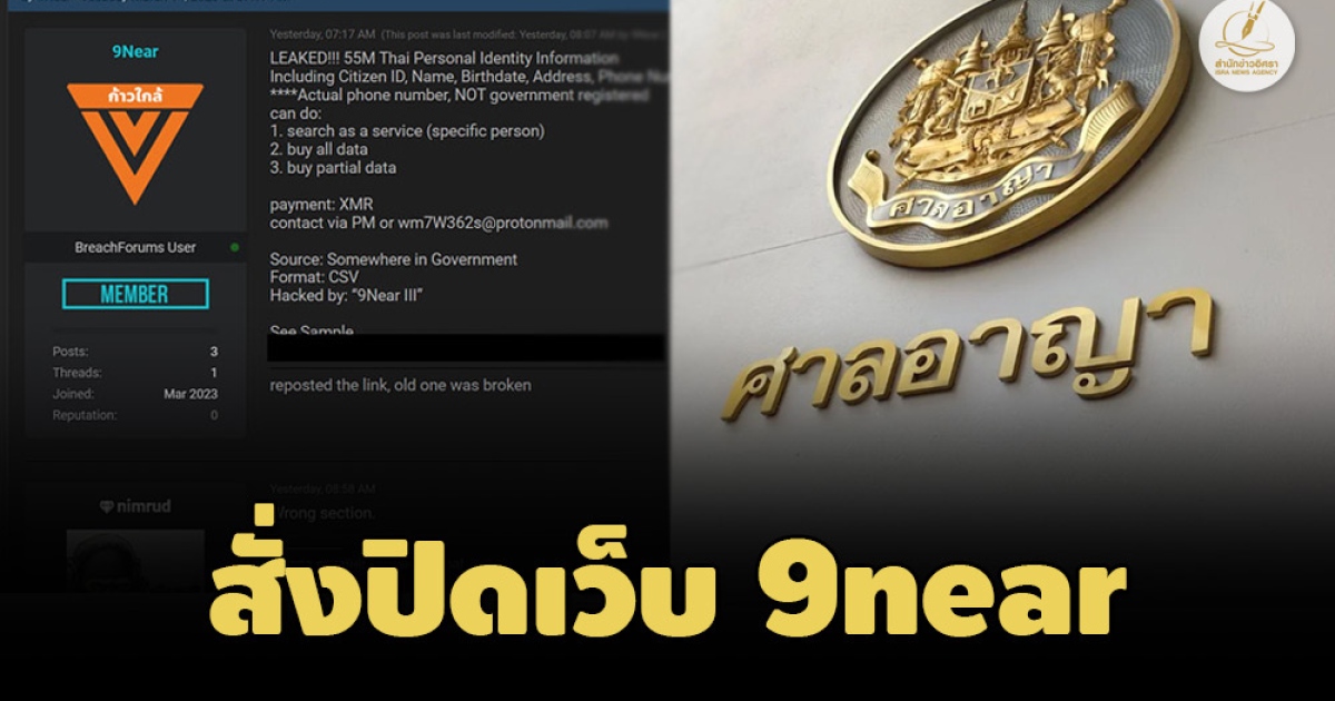 ศาลอาญาสั่งปิดเว็บไซต์ 9near.org หลังระบุมีข้อมูลคนไทย 55 ล้านรายชื่อ เตรียมเผยแพร่ ชี้เป็นการบิดเบือน เนื้อหาเข้าข่ายผิดตาม พ.ร.บ.คอมพิวเตอร์ฯ สร้างความเสียหายต่อการรักษาความมั่นคงของประเทศ