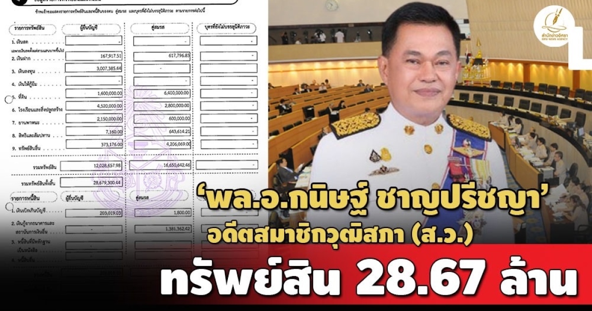 ป.ป.ช. เปิดบัญชีทรัพย์สิน 'พล.อ.กนิษฐ์ ชาญปรีชญา' อดีต ส.ว. ทรัพย์สินกว่า 28 ล.มีที่ดินและบ้าน 2 หลังใน ปากช่อง นครราชสีมา สะสมปืนพก-กรอบพระเลี่ยมทอง-แหวนเพชร ภรรยามีเข็มขัดทองหนัก 20 บ. -สร้อยข้อมือทองหนัก 20 บ.
