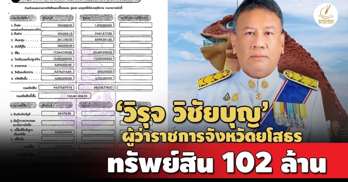 ป.ป.ช.เปิดบัญชีทรัพย์สิน 'วิรุจ วิชัยบุญ' ผู้ว่าราชการจังหวัดยโสธร ทรัพย์สินกว่า 102 ล. มีที่ดิน ในอุบลราชธานี-ปราจีนบุรี มีห้องชุดที่พญาไท กทม. สะสมอาวุธปืน-ทองคำแท่งหนัก 1 บาท 20 แท่ง-พระแก้วมรกตทองคำ-แหวนทองคำ รายได้ 1.4 ล./ปี