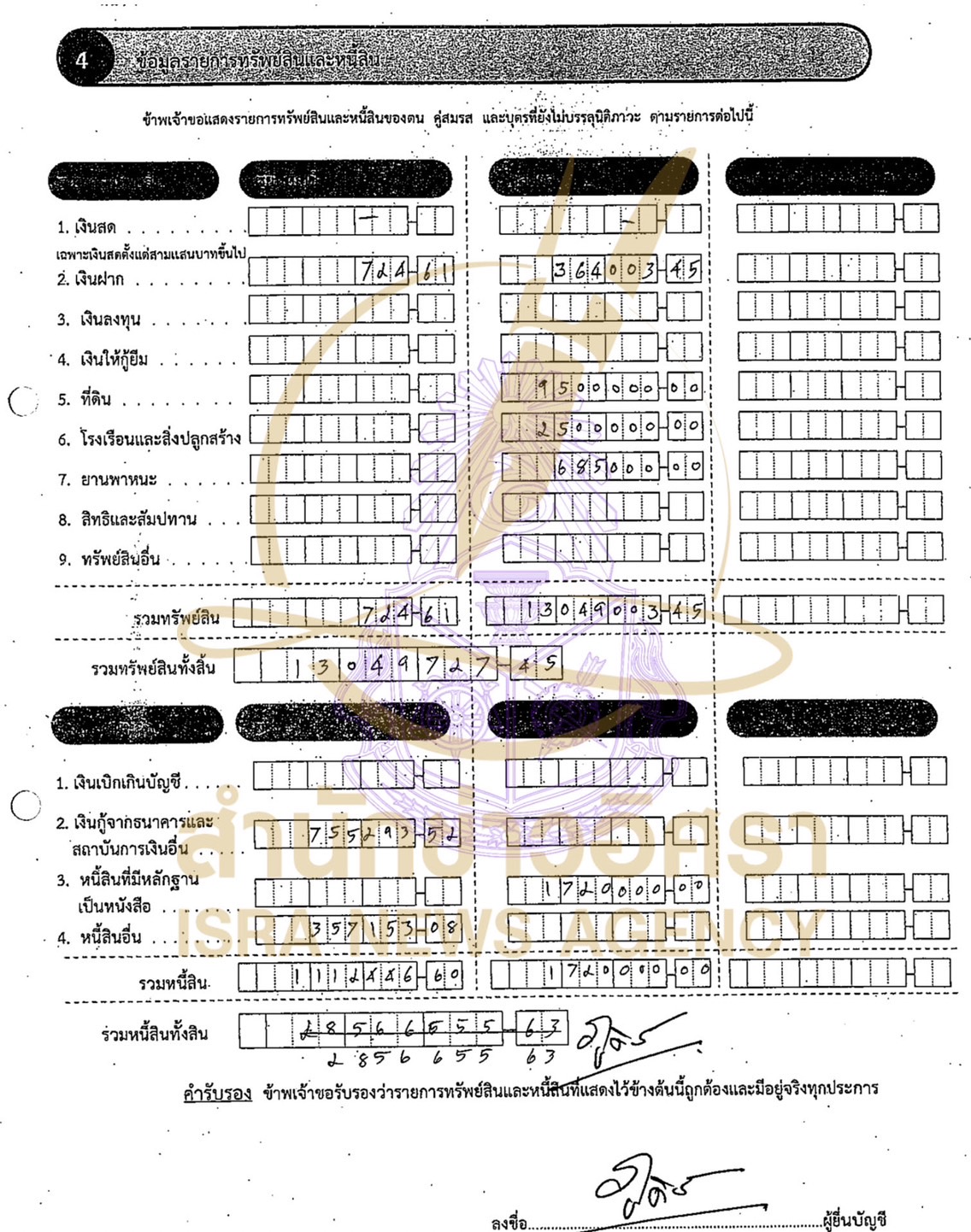 โดยนายวันชัย พร้อมด้วย น.ส.นงนุช สว่างอารมย์ ผู้อยู่กินกันฉันสามีภริยาแจ้งทรัพย์สินทั้งสิ้น 63,982,774 บาท ไร้หนี้สิน