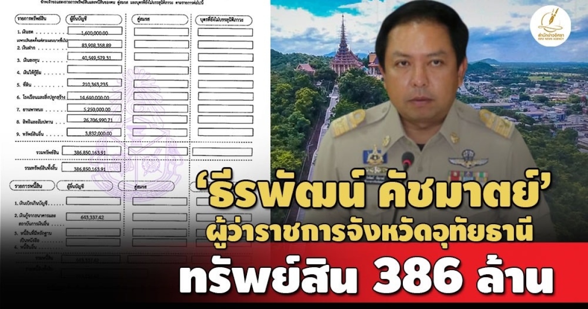 ป.ป.ช.เปิดบัญชีทรัพย์สิน 'ธีรพัฒน์ คัชมาตย์' ผู้ว่าราชการจังหวัดอุทัยธานี ทรัพย์สินกว่า 386 ล. มีที่ดิน 142 รายการ ที่นนทบุรี/พิษณุโลก/กรุงเทพฯ สะสมแหวนเพชร-นาฬิกา-สร้อยคอทองคำหนัก 32 บ.-งาช้าง รายได้ 8.6 ล./ปี