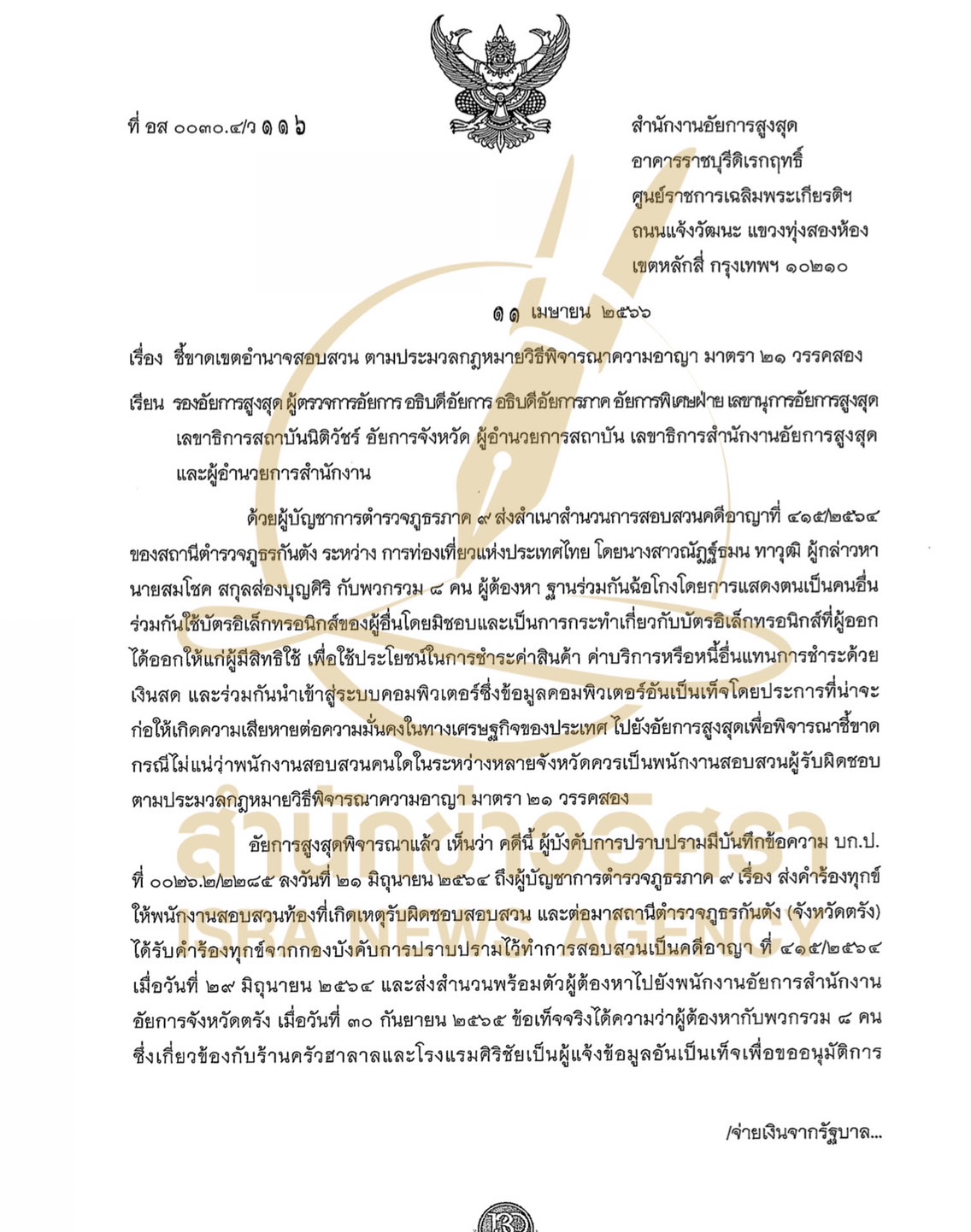 สำนักข่าวอิศรา (www.isranews.org) รายงานว่า เมื่อวันที่ 11 เมษายน 2566 ที่ผ่านมา สำนักงานอัยการสูงสุด (อสส.) ได้ทำหนังสือเวียนแจ้งผู้บริหารในหน่วยงานทุกระดับ ชี้ขาดเขตอำนาจสอบสวน กรณีปรากฏข้อมูลว่าการท่องเที่ยวแห่งประเทศไทย ได้ร้องทุกข์กล่าวโทษต่อพนักงานสอบสวนกองบังคับการปราบปรามให้ดําเนินคดีกับผู้ประกอบธุรกิจ ที่เข้าร่วมโครงการเราเที่ยวด้วยกันซึ่งเป็นโรงแรมจํานวน 448 ราย และร้านค้าจํานวน 486 ราย รวมทั้งสิ้น 934 ราย ซึ่งมีภูมิลําเนาอยู่ในหลายท้องที่ทั่วราชอาณาจักร โดยให้พนักงานสอบสวนสถานีตำรวจภูธร เป็นพนักงานสอบสวนผู้รับผิดชอบในการสอบสวนคดีนี้ หลังมีกรณีไม่แน่ชัดพนักงานสอบสวนคนใดในระหว่างหลายจังหวัดควรเป็นผู้รับผิดชอบ
