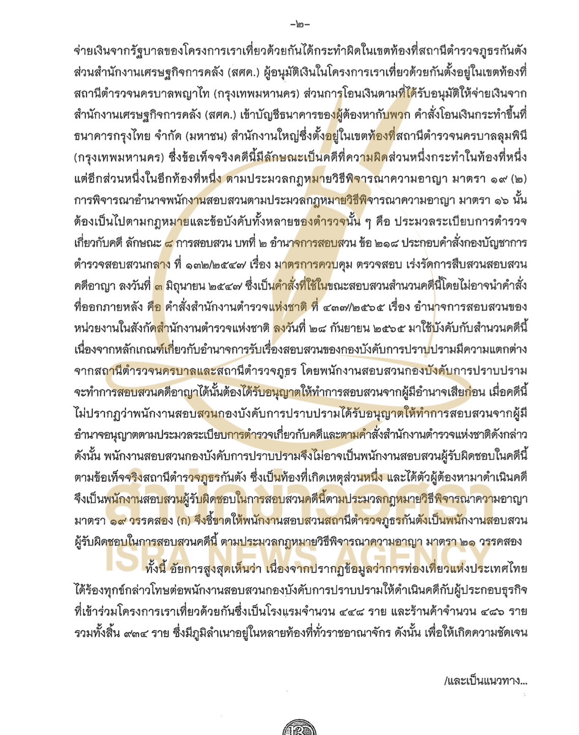 ทั้งนี้ อัยการสูงสุดเห็นว่า เนื่องจากปรากฏข้อมูลว่าการท่องเที่ยวแห่งประเทศไทย ได้ร้องทุกข์กล่าวโทษต่อพนักงานสอบสวนกองบังคับการปราบปรามให้ดําเนินคดีกับผู้ประกอบธุรกิจ ที่เข้าร่วมโครงการเราเที่ยวด้วยกันซึ่งเป็นโรงแรมจํานวน 448 ราย และร้านค้าจํานวน 486 ราย รวมทั้งสิ้น 934 ราย ซึ่งมีภูมิลําเนาอยู่ในหลายท้องที่ทั่วราชอาณาจักร