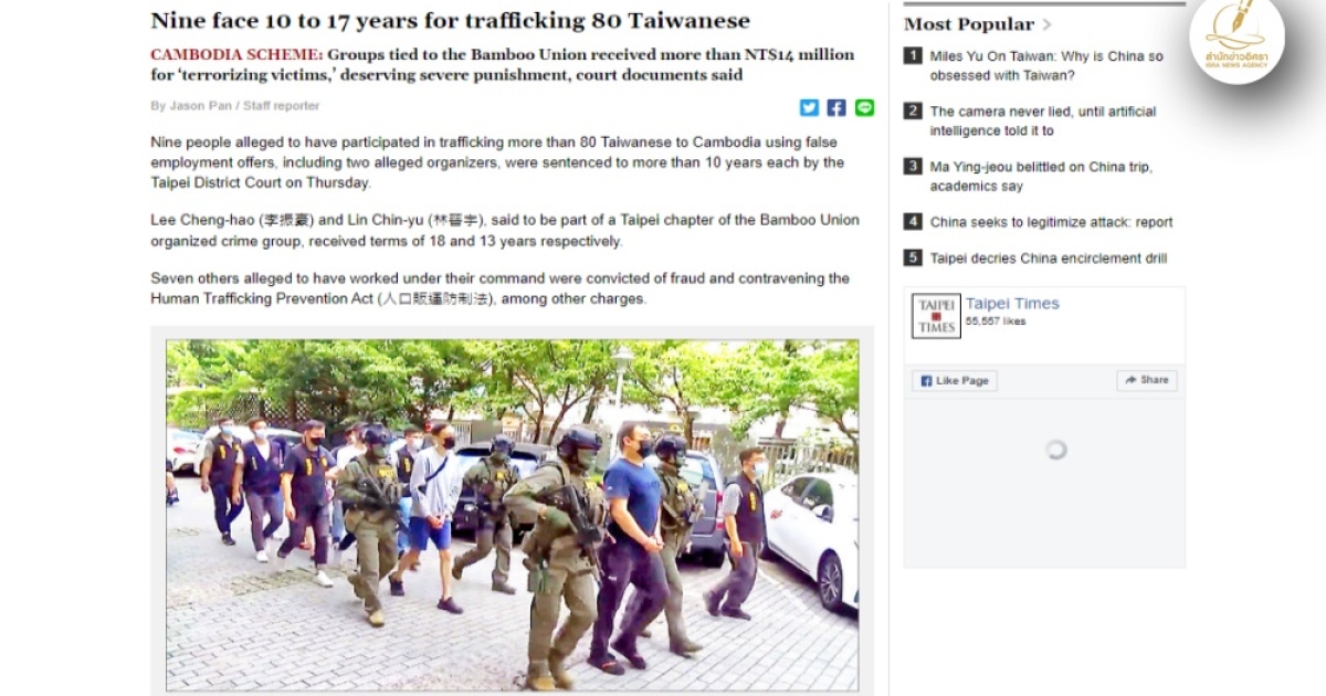 สำนักข่าวอิศรา (www.isranews.org) รายงานข่าวเกี่ยวกับขบวนการฉ้อโกงในต่างประเทศที่เกี่ยวข้องกับประเทศไทยว่า ศาลประเทศไต้หวันได้มีคำพิพากษาให้จำคุกจำเลยจำนวน 9 คน เป็นระยะเวลาตั้งแต่ 11-18 ปี ในข้อหาว่ามีส่วนในการล่อลวงเหยื่อจำนวนนับสิบรายไปยังประเทศกัมพูชาเพื่อให้ทำงานให้กับขบวนการฉ้อโกงออนไลน์