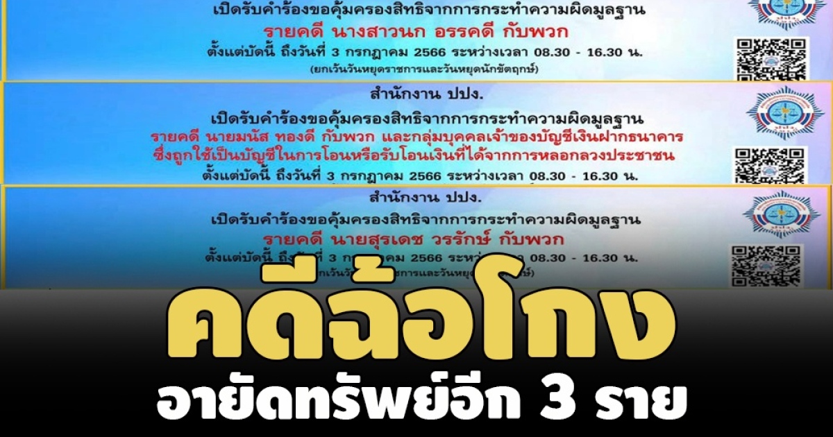 สำนักข่าวอิศรา (www.isranews.org) รายงานว่า เมื่อวันที่ 5 เม.ย.2566 ที่ผ่านมา ราชกิจจานุเบกษาได้เผยแพร่ประกาศสำนักงานป้องกันและปราบปรามการฟอกเงิน เรื่อง ให้ผู้เสียหายยื่นคำร้องขอคุ้มครองสิทธิจากการกระทำความผิดมูลฐาน 3 ราย ได้แก่ นางสาวนก อรรคดี กับพวก รายนายสุรเดช วรรักษ์ กับพวก และ รายนายมนัส ทองดี กับพวกและกลุ่มบุคคลเจ้าของบัญชีเงินฝากธนาคารซึ่งถูกใช้เป็นบัญชีในการโอนหรือรับโอนเงินที่ได้จากการหลอกลวงประชาชน ดังนี้