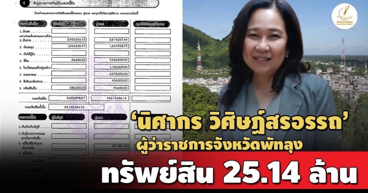 ป.ป.ช.เปิดบัญชีทรัพย์สิน 'นิศากร วิศิษฏ์สรอรรถ' ผู้ว่าราชการจังหวัดพัทลุง ทรัพย์สินกว่า 25 ล้าน มีที่ดินใน อ.ประจันตคาม ปราจีนบุรี สะสมเครื่องประดับเพชร-อาวุธปืน รายได้ 1.2ล./ปี