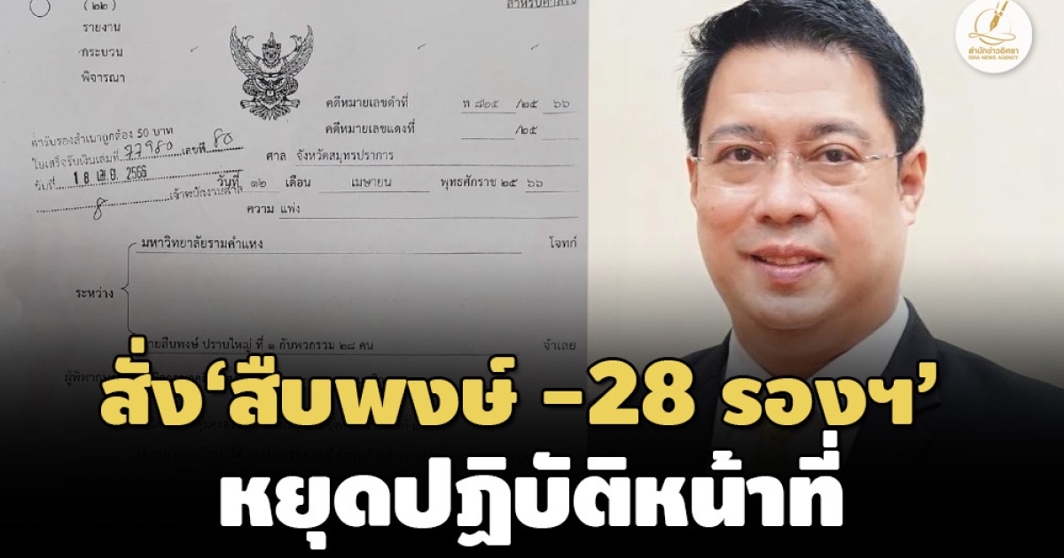 ศาลจังหวัดสมุทรปราการ สั่งคุ้มครองชั่วคราว ไฟเขียว 'สภามหาวิทยาลัยรามคำแหง' เลิกจ้าง 'สืบพงษ์ ปราบใหญ่' ได้ ชี้นำวุฒิปริญญาเอกที่ไม่ได้รับการรับรองจาก ก.พ. จึงเป็นผู้ขาดคุณสมบัติ ต้องหยุดปฏิบัติหน้าที่อธิการบดีทันที พร้อมให้ขนของออกจากสำนักงาน