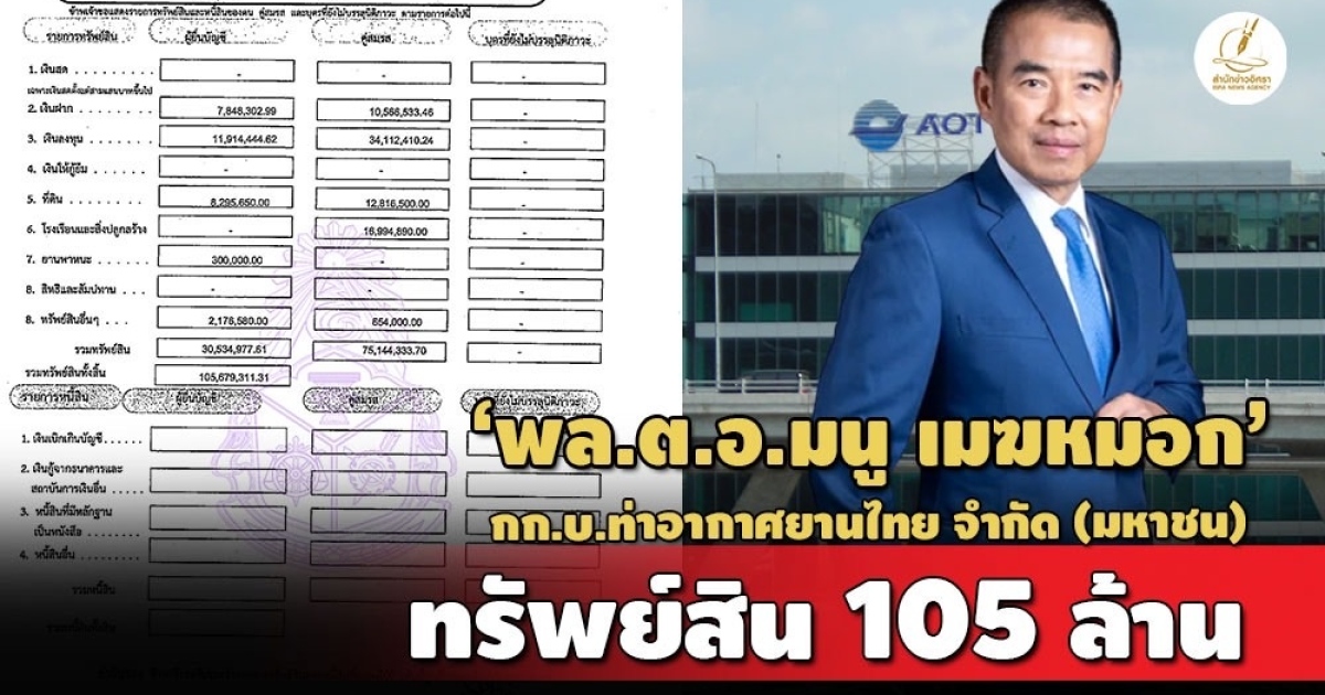 ป.ป.ช.เปิดบัญชีทรัพย์สิน 'พล.ต.อ.มนู เมฆหมอก' กรรมการบริษัท ท่าอากาศยานไทย จำกัด (มหาชน) ทรัพย์สินกว่า 105 ล้าน มีที่ดินใน อ.ชะอำ/เมือง จ.เพชรบุรี สะสมสร้อยคอทองคำ-พระเลี่ยมทอง-อาวุธปืน-แหวนทองคำ รายได้ 4.4 ล./ปี