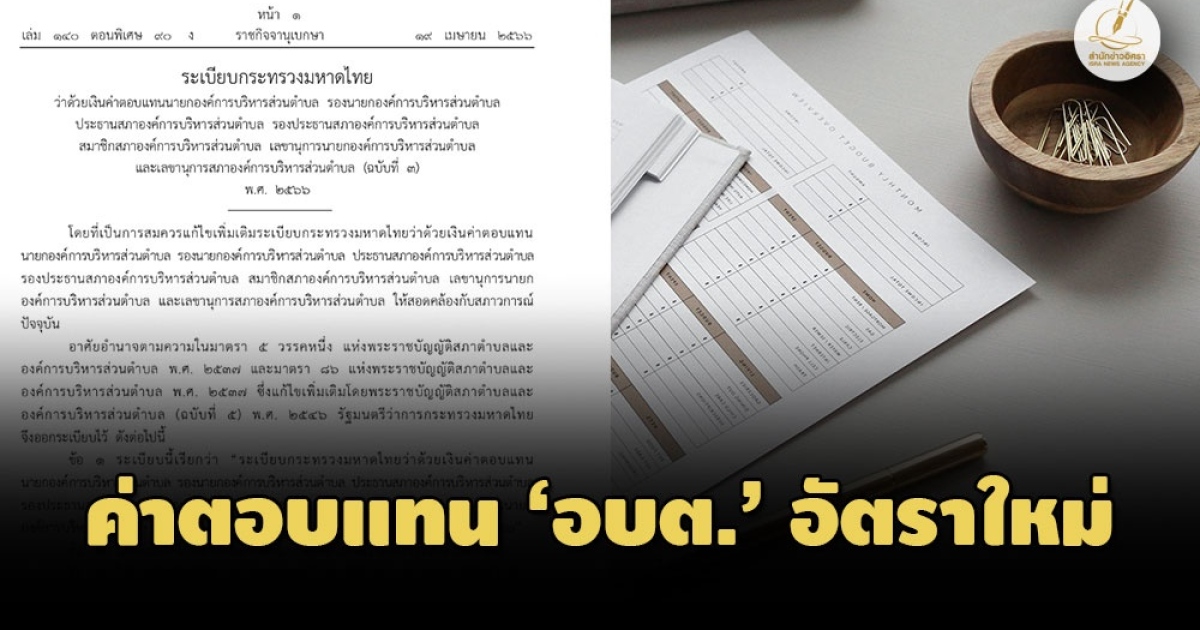 ราชกิจจานุเบกษา เผยแพร่ระเบียบกระทรวงมหาดไทยว่าด้วยเงินค่าตอบแทน 'อบต.' อัตราใหม่ ใช้บังคับตั้งแต่ 20 เม.ย. 2566 เป็นต้นไป