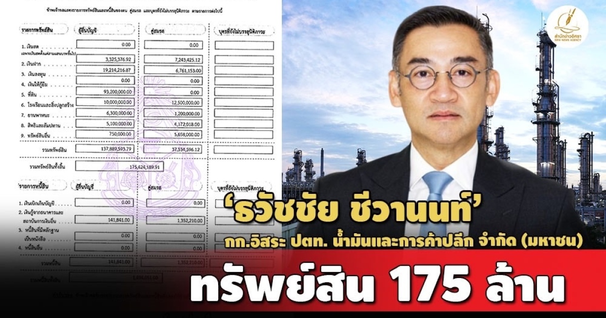 ป.ป.ช.เปิดบัญชีทรัพย์สิน 'ธวัชชัย ชีวานนท์' กรรมการอิสระ บริษัท ปตท. น้ำมันและการค้าปลีก จำกัด (มหาชน) ทรัพย์สินกว่า 175 ล้าน สะสมนาฬิกายีห้อดัง-เครื่องประดับ รายได้ 11 ล./ปี