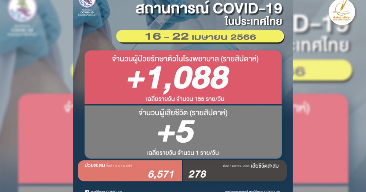 สถานการณ์โควิดไทย สัปดาห์ล่าสุด 16 - 22 เม.ย. 2566 ติดเชื้อเข้ารักษาใน รพ.ใหม่ 1,088 เฉลี่ย 155 เสียชีวิต 5 ราย อาการหนัก 73ราย