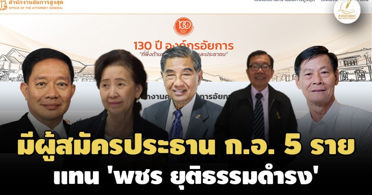 สำนักข่าวอิศรา (www.isranews.org) รายงานว่า เมื่อวันที่ 24 เม.ย. 2566 สำนักงานคณะกรรมการอัยการ เผยแพร่ข่าวประชาสัมพันธ์ ในการประชุมคณะกรรมการอัยการ (ก.อ.)ครั้งที่ 4/2566 ณ มีมติรับทราบและให้ดำเนินการต่อไปในบัญชีรายชื่อของผู้ที่มาสมัครเป็นประธาน ก.อ. จำนวน 5 ราย แทนนายพชร ยุติธรรมดำรง ประธาน ก.อ. ที่จะหมดวาระวันที่ 25 พ.ค. 2566 ดังนี้