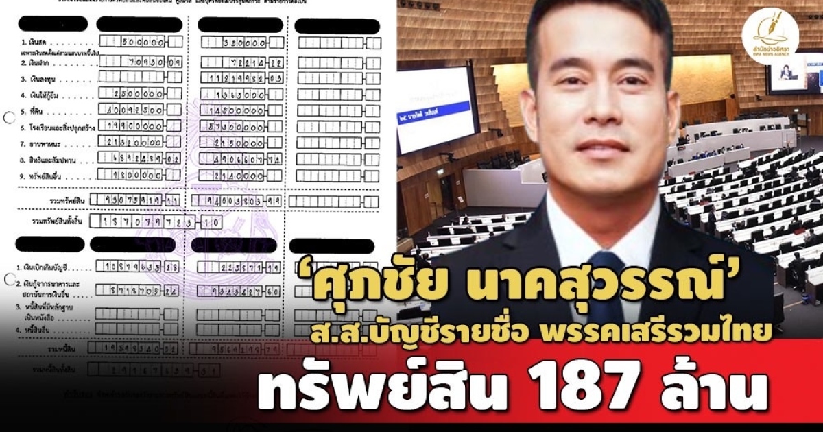 ป.ป.ช.เปิดบัญชีทรัพย์สิน 'ศุภชัย นาคสุวรรณ์' ส.ส.แบบบัญชีรายชื่อ พรรคเสรีรวมไทย ทรัพย์สินกว่า 187 ล้าน มีที่ดินใน จ.สุราษฎร์ธานี สะสมอาวุธปืน-กำไลทอง-พระเครื่อง-สร้อยคอทองคำ รายได้ 6.3 ล./ปี