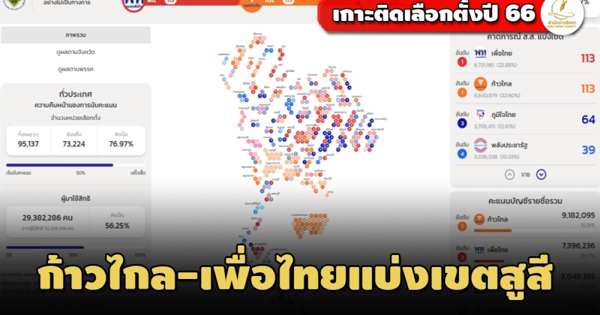 กกต.เผยความคืบหน้าผลนับคะแนนเลือกตั้ง 23.39 น. ก้าวไกล เพื่อไทยแข่ง ส.ส.แบ่งเขตสูสี ล่าสุดจำนวน ส.ส.แบ่งเขต 113 ที่นั่ง ส่วนบัญชีรายก้าวไกลได้คะแนนทะลุ 9 ล้าน ขณะภูมิใจไทยได้อันดับ 3 แบ่งเขต 64 ที่นั่ง