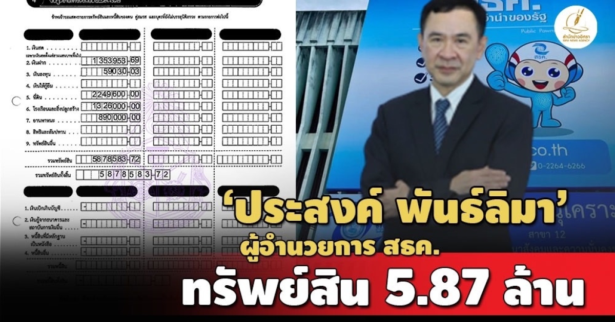 ป.ป.ช.เปิดบัญชีทรัพย์สิน 'ประสงค์ พันธ์ลิมา' ผู้อำนวยการสำนักงานธนานุเคราะห์ ทรัพย์สินกว่า 5.87 ล้าน มีที่ดินและบ้านที่ อ.เมือง จ.นนทบุรี รายได้ 3.5 ล./ปี