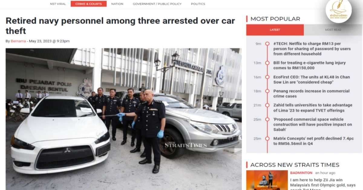 สำนักข่าวอิศรา (www.isranews.org) รายงานข่าวสถานการณ์ที่เกี่ยวกับการขโมยรถในประเทศมาเลเซียว่าทางการมาเลเซียได้จับกุมชายสามคนรวมไปถึงนายทหารเรือปลดเกษียณ เมื่อวันที่ 13 พ.ค.ที่ผ่านมา ด้วยข้อหาว่าทั้งหมดอาจมีส่วนเกี่ยวกับชบวนการขโมยรถ