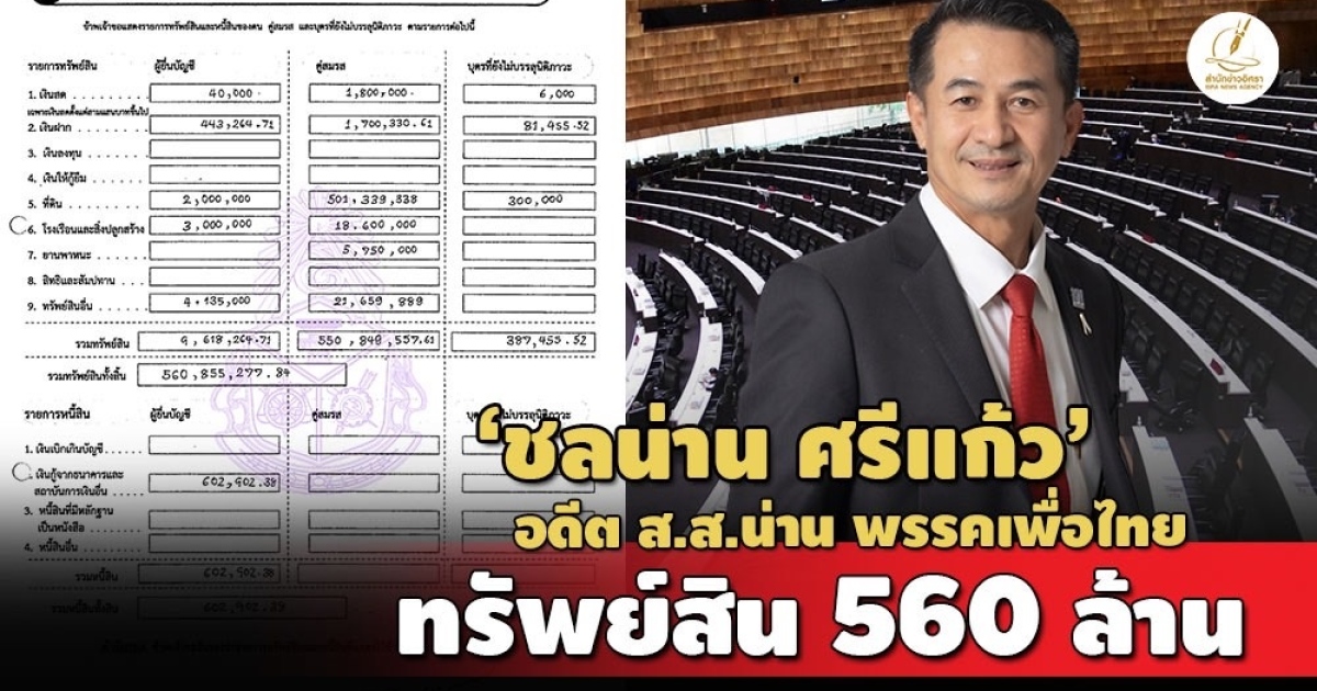ป.ป.ช.เปิดบัญชีทรัพย์สิน 'ชลน่าน ศรีแก้ว' กรณีพ้นตำแหน่ง ส.ส.น่าน พรรคเพื่อไทย ทรัพย์สินกว่า 560 ล้าน มีที่ดินและตึก 3 ชั้นที่ จ.น่าน สะสมสร้อยทองคำ-แหวนหยกล้อมเพชร-พระเครื่อง รายได้ 1.7 ล./ปี
