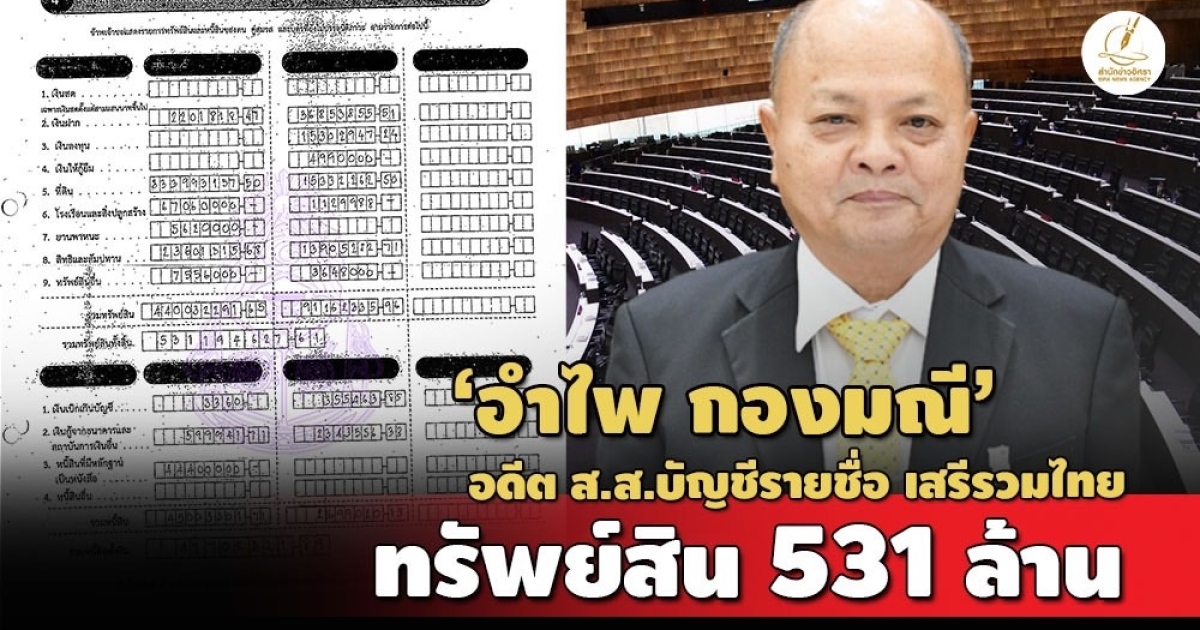 ป.ป.ช.เปิดบัญชีทรัพย์สิน 'อำไพ กองมณี' กรณีพ้นตำแหน่ง ส.ส.บัญชีรายชื่อ พรรคเสรีรวมไทย ทรัพย์สินกว่า 531 ล้าน สะสมสร้อยทองคำ-แหวนเพชร-พระเครื่อง-อาวุธปืน รายได้ 4.3 ล./ปี ภรรยามีทองคำแท่งหนัก 130 บาท