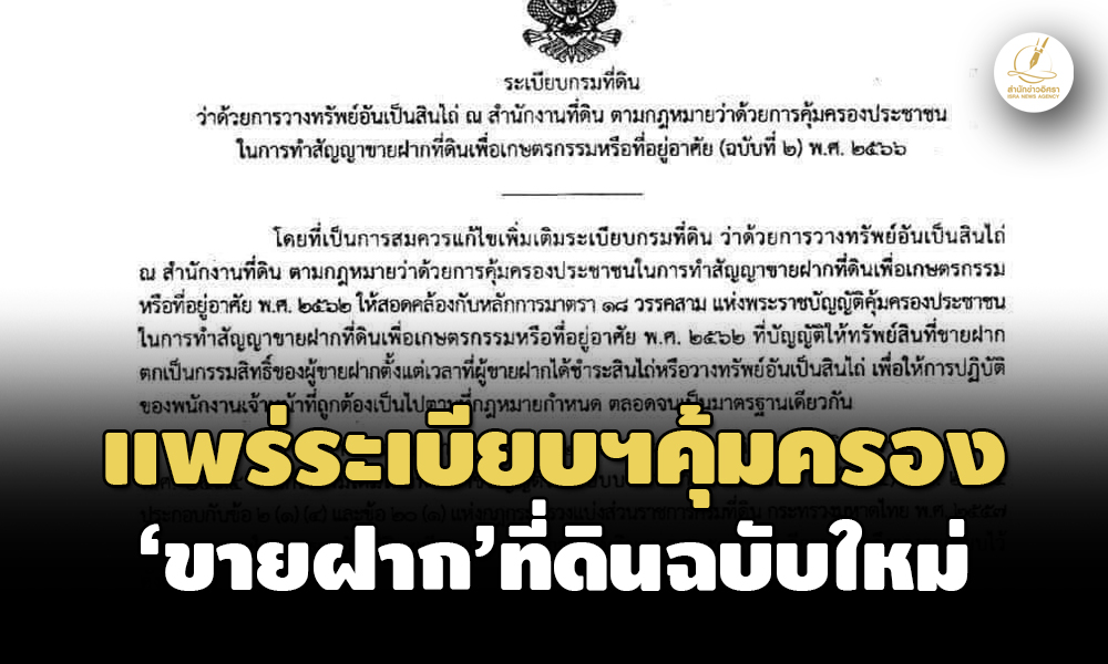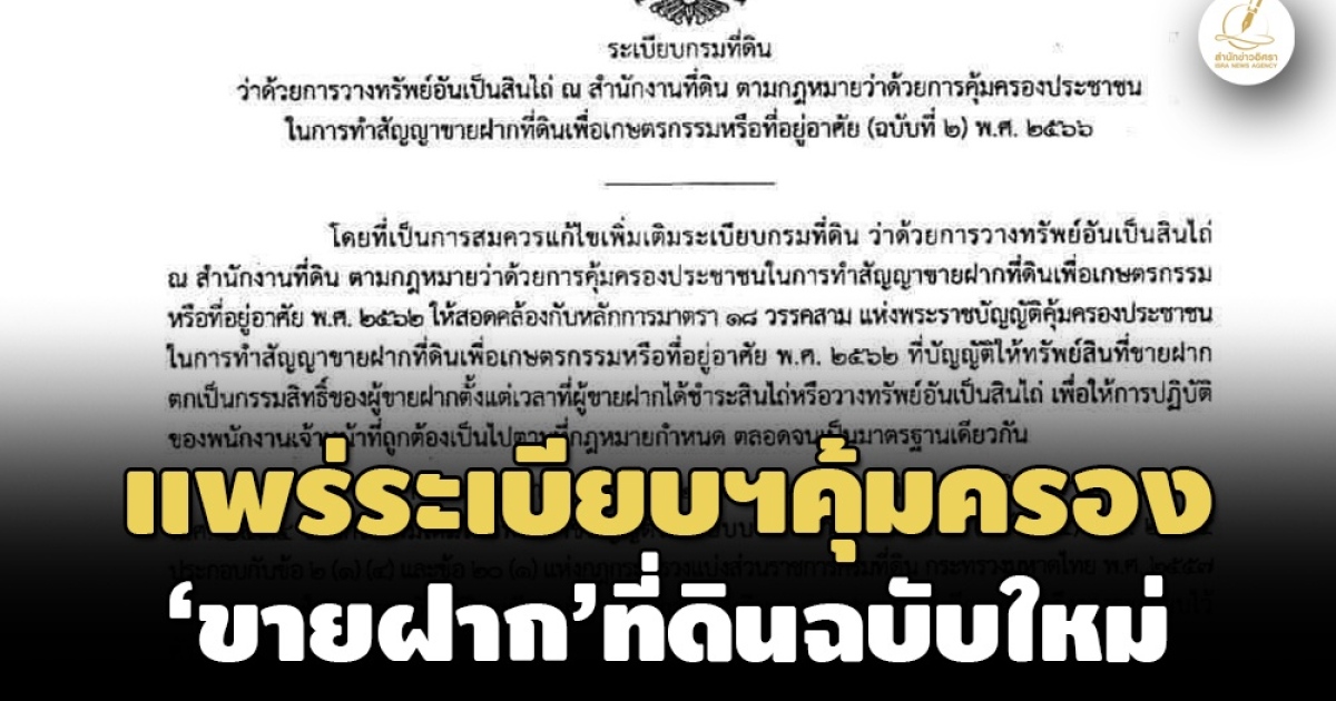 สำนักข่าวอิศรา (www.isranews.org) รายงานว่า วันที่ 25 พ.ค.2566 ที่ผ่านมา นายชยาวุธ จันทร อธิบดี กรมที่ดิน ได้ลงนามประกาศระเบียบกรมที่ดินว่าด้วยการวางทรัพย์อันเป็นสินไถ่ ณ สำนักงานที่ดิน ตามกฎหมายว่าด้วยการคุ้มครองประชาชนในการทำสัญญาขายฝากที่ดินเพื่อเกษตรกรรมหรือที่อยู่อาศัย (ฉบับที่ 2) พ.ศ.2566 เพื่อให้การปฏิบัติของพนักงานเจ้าหน้าที่ถูกต้องเป็นไปตามที่กฎหมายกำหนด และเป็นมาตรฐานเดียวกัน