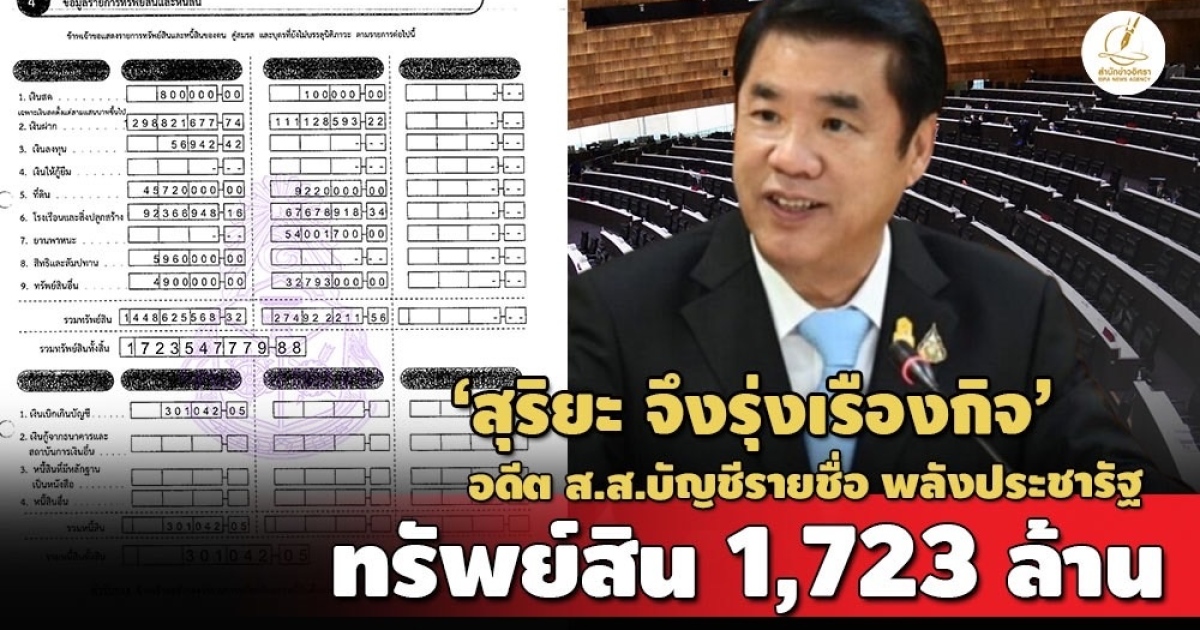ป.ป.ช.เปิดบัญชีทรัพย์สิน 'สุริยะ จึงรุ่งเรืองกิจ' อดีต ส.ส.บัญชีรายชื่อ พลังประชารัฐ และอดีต รมว.อุตสาหกรรม กว่า 1,723 ล้าน มีป้ายทะเบียนรถ ษง 9999 - พระบรมรูปหล่อครึ่งพระองค์ทองแดง รายได้ 3.9 ล./ปี ภรรยา เพชร 1 เม็ด-สร้อยเพชร มรกต