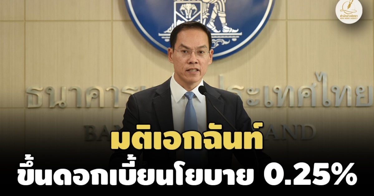 ‘กนง.’ มีมติเอกฉันท์ขึ้นดอกเบี้ยนโยบาย 0.25% สู่ระดับ 2% ประเมิน 'เศรษฐกิจไทย' มีโอกาสเติบโตสูงกว่าที่คาดไว้ จากปัจจัย 'นโยบายเศรษฐกิจภาครัฐ' ชี้อัตราเงินเฟ้อมีความเสี่ยง ‘ด้านสูง’ จากแรงกดดันด้านอุปทาน