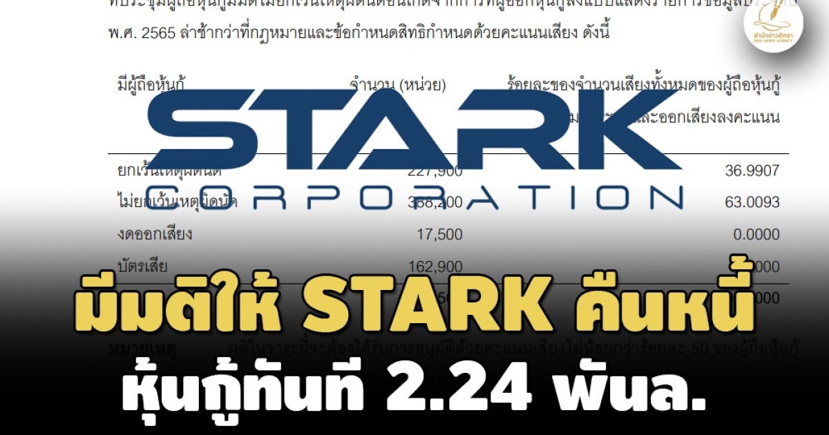 ขณะเดียวกัน ในการประชุมผู้ถือหุ้นกู้ บมจ.สตาร์ค คอร์เปอเรชั่น ครั้งที่ 2/2565 ที่ครบกำหนดไถ่ถอนปีพ.ศ. 2567 (STARK242A) ซึ่งมีการจัดประชุมในวันที่ 31 พ.ค.2566 เช่นกันนั้น ที่ประชุมผู้ถือหุ้นกู้เสียงข้างมาก หรือคิดเป็น 76.75% ของจำนวนเสียงทั้งหมดของผู้ถือหุ้นกู้ที่เข้ามาประชุมและออกเสียงลงคะแนน มีมติยกเว้นเหตุผิดนัดอันเกิดจากการที่ผู้ออกหุ้นกู้ส่งแบบแสดงรายการข้อมูลประจำปี พ.ศ.2565 ล่าช้ากว่าที่กฎหมายและข้อกำหนดสิทธิกำหนด