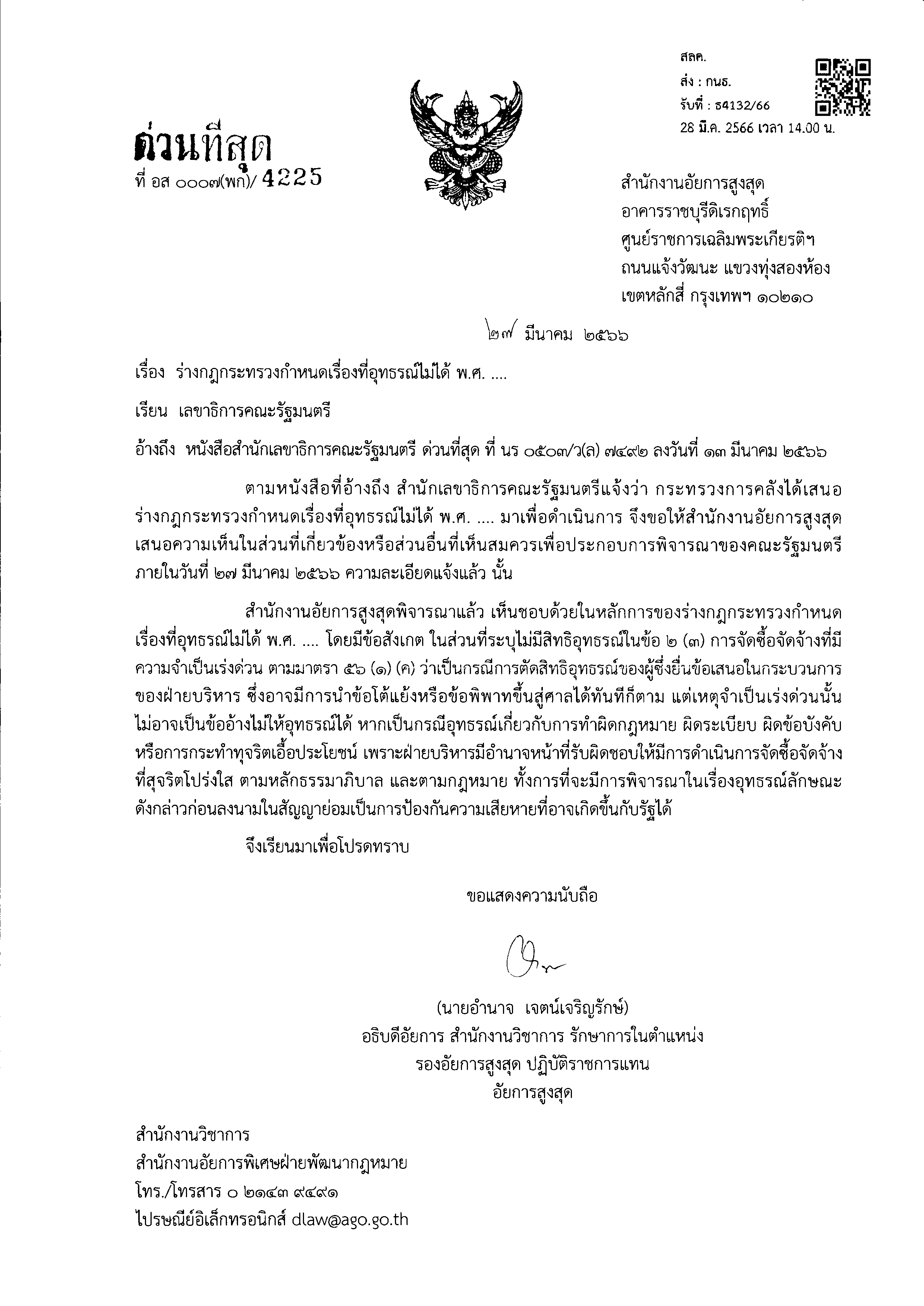 อย่างไรก็ตาม สำนักงานอัยการสูงสุด (อส.) ได้เสนอความเห็นประกอบการพิจารณาของ ครม. ในเรื่องดังกล่าว ว่า สำนักงานอัยการสูงสุดพิจารณาแล้ว เห็นชอบด้วยในหลักการของร่างกฎกระทรวงกำหนดเรื่องที่อุทธรณ์ไม่ได้ พ.ศ.... โดยมีข้อสังเกต ในส่วนที่ระบุไม่มีสิทธิอุทธรณ์ในข้อ 2 (3) การจัดซื้อจัดจ้างที่มีความจำเป็นเร่งด่วน ตามมาตรา 56 (1) (ค) ว่า เป็นกรณีการตัดสิทธิอุทธรณ์ของผู้ซึ่งยื่นข้อเสนอในกระบวนการของฝ่ายบริหาร ซึ่งอาจมีการนำข้อโต้แย้งหรือข้อพิพาทขึ้นสู่ศาลได้ทันทีก็ตาม