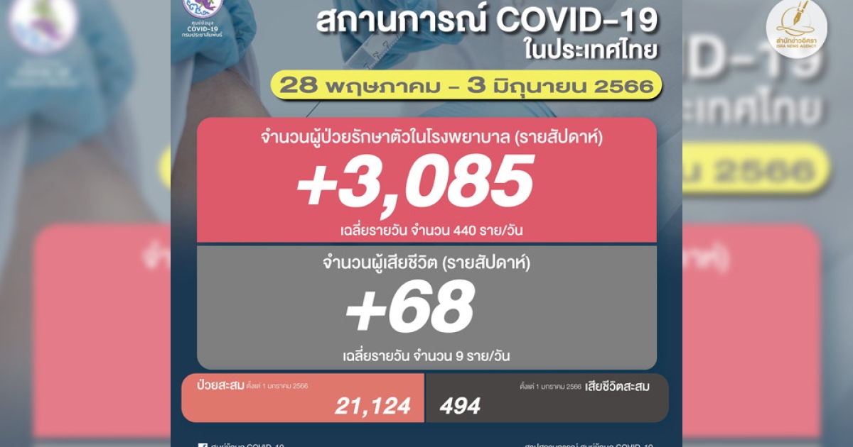 สถานการณ์โควิดไทย สัปดาห์ล่าสุด 28 พ.ค. - 3 มิ.ย. 2566 ติดเชื้อเข้ารักษาใน รพ.ใหม่ 3,085 ราย เฉลี่ย 440/วัน เสียชีวิต 68 ราย อาการหนัก 386 ราย