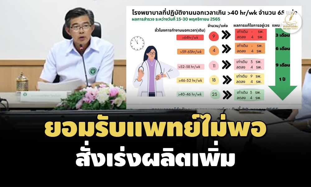สธ.ยอมรับแพทย์ไม่พอกับภาระงาน พบ 9 โรงพยาบาล หมอทำงานหนัก 64 ชม./สัปดาห์ สั่งเร่งผลิตเพิ่ม แก้ปัญหาขาดแคลน เผยมีแพทย์ลาออกเฉลี่ยปีละ 455 ไม่ถึง 900 คน ตามที่มีคนกล่าวอ้าง