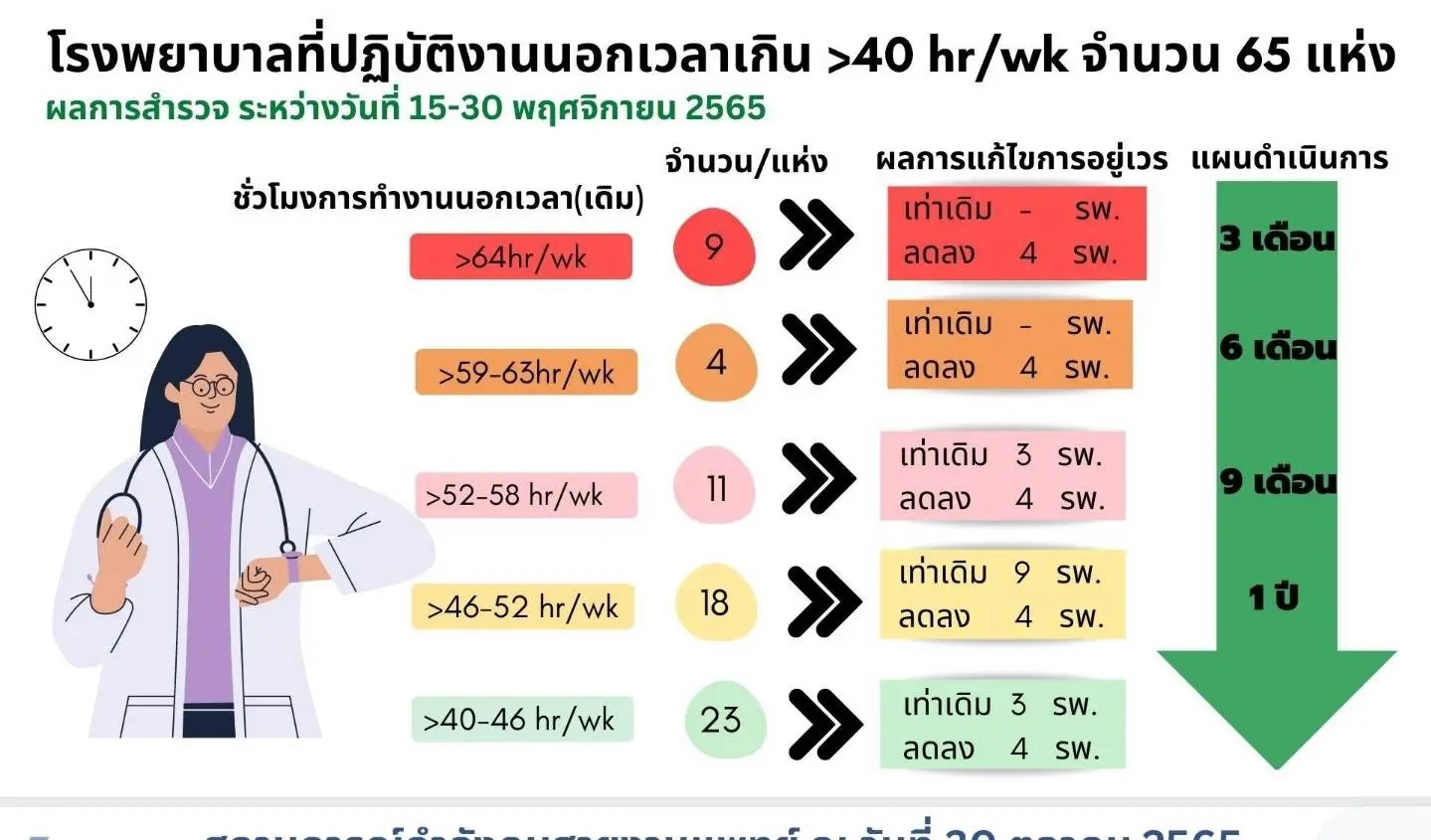 เมื่อจำนวนจัดสรรมาไม่เพียงพอ ทำให้มีภาระงานเพิ่ม อย่างภาระงานที่เป็น UC ก็เข้ามารับบริการได้ ทางกระทรวงฯ ไม่เคยปฏิเสธ อย่างไรก็ตาม ข้อมูลผลสำรวจระหว่างวันที่ 15-30 พฤศจิกายน 2565 เราพบชั่วโมงการทำงานนอกเวลา แบ่งออกเป็น 1.ทำงานมากกว่า 64 ชั่วโมงต่อสัปดาห์ มี 9 แห่ง แผนดำเนินงานแก้ไข 3 เดือน 2.ทำงานมากกว่า 59-63 ชั่วโมงต่อสัปดาห์ มี 4 แห่ง แผนดำเนินงานแก้ไข 6 เดือน 3.ทำงานมากกว่า 52-58 ชั่วโมงต่อสัปดาห์มี 11 แห่ง แผนดำเนินงานแก้ไข 9 เดือน 4.ทำงานมากกว่า 46-52 ชั่วโมงต่อสัปดาห์มี 18 แห่ง และทำงานมากกว่า 40-46 ชั่วโมงต่อสัปดาห์มี 23 แห่ง โดยแผนดำเนินการแก้ไข 1 ปีขึ้นไป