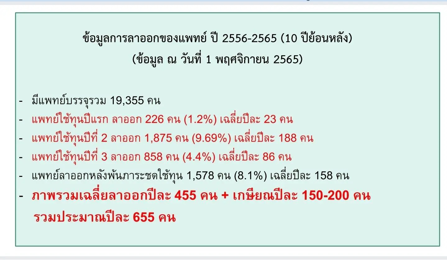 สำหรับข้อมูลการลาออกของแพทย์ 10 ปีย้อนหลัง ระหว่างปี 2556-2565 พบว่า มีแพทย์บรรจุรวม 19,355 คน โดยแพทย์ใช้ทุนปีแรก ลาออก 226 คน คิดเป็น 1.2% เฉลี่ยปีละ 23 คน ซึ่งถือว่าน้อย เพราะต้องอยู่ให้ครบตามแพทยสภากำหนดจึงจะไปสอบเชี่ยวชาญได้ ขณะที่ แพทย์ใช้ทุนปีที่ 2 ลาออกเยอะหน่อย เพราะครบคุณสมบัติไปเป็นแพทย์เฉพาะทางได้ ตัวเลขอยู่ที่ 1,875 คน คิดเป็น 9.69% เฉลี่ยปีละ 188 คน แพทย์ใช้ทุนปีที่ 3 ลาออก 858 คน คิดเป็น 4.4% เฉลี่ยปีละ 86 คน โดยแพทย์ลาออกหลังพ้นภาระชดใช้ทุน 1,578 คน คิดเป็น 8.1% เฉลี่ยปีละ 158 คน โดยสรุปภาพรวมเฉลี่ยลาออกปีละ 455 คน นอกจากนี้ยังมีเกษียณปีละ 150-200 คน รวมประมาณปีละ 655 คน