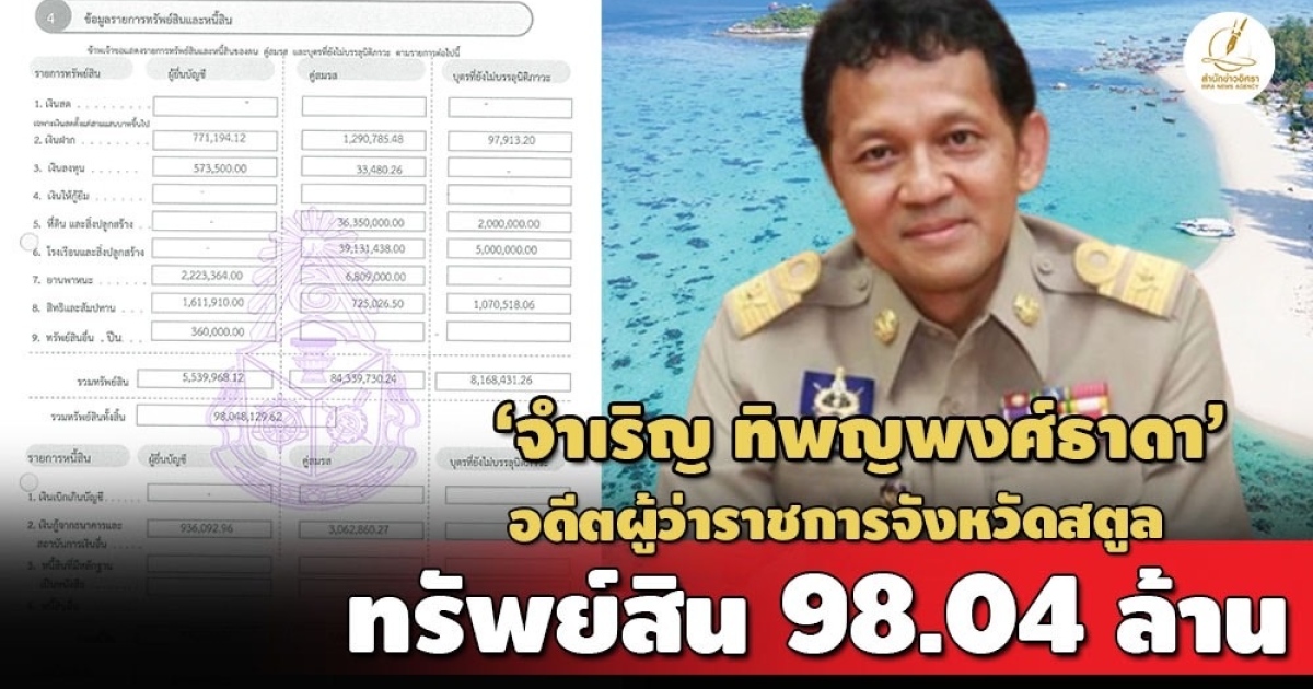 ป.ป.ช.เปิดบัญชีทรัพย์สิน 'จำเริญ ทิพญพงศ์ธาดา' กรณีพ้นตำแหน่ง ผู้ว่าราชการจังหวัดสตูล ทรัพย์สินกว่า 98 ล. มีอาวุธปืน 6 กระบอก รายได้ 1.3 ล./ปี ภรรยามีที่ดิน 25 แปลง มีรถยนต์ 11 คัน Ford-mini-BMW-Jaguar-Volkswagen