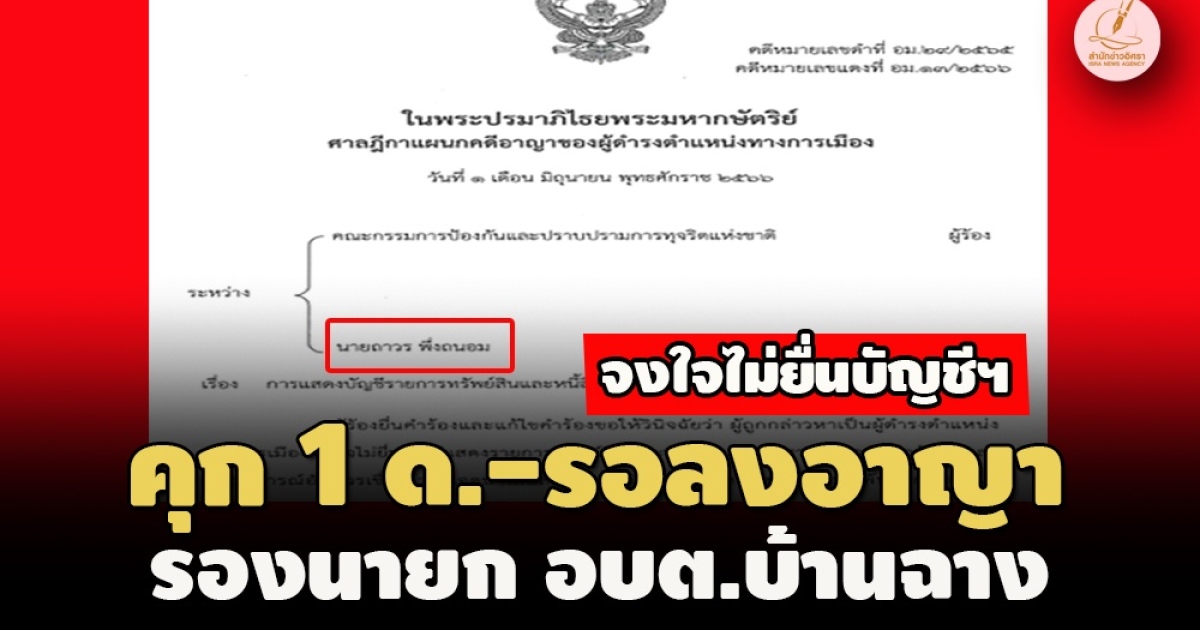 - คุก1 เดือน ปรับ 4,000 บ. รองนายกเทศฯ ต.ขวาว ร้อยเอ็ด ยื่นบัญชีฯเท็จ -รอลงโทษ 1 ปี