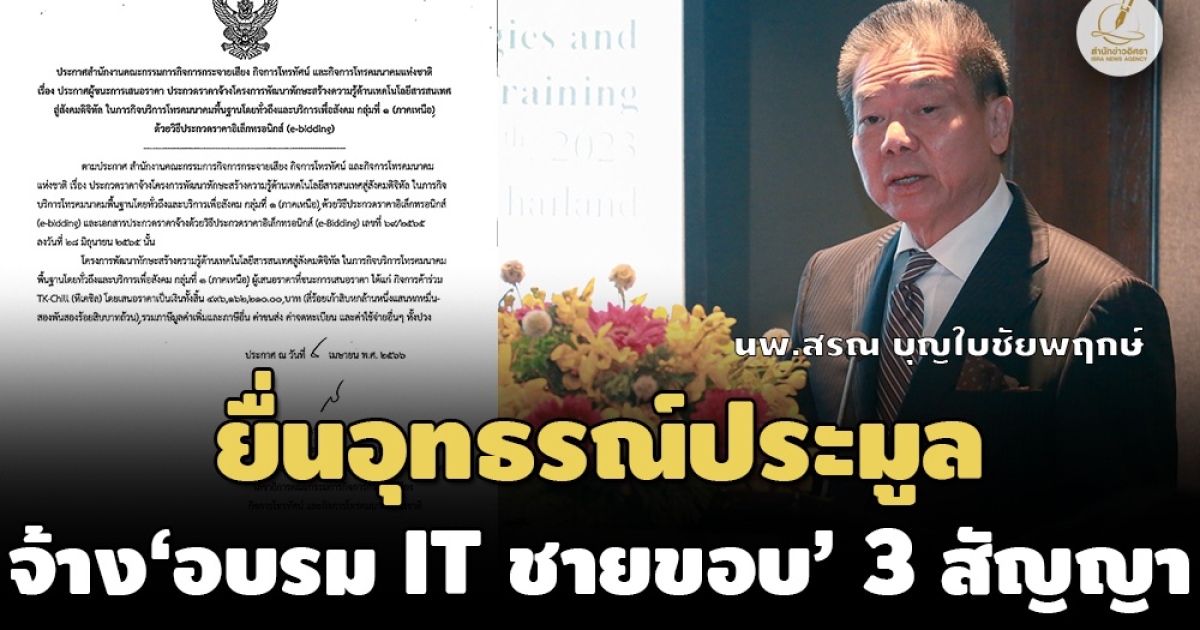 สืบเนื่องจากกรณีที่เมื่อวันที่ 4 เม.ย.ที่ผ่านมา สำนักงานคณะกรรมการกิจการกระจายเสียง กิจการโทรทัศน์ และกิจการโทรคมนาคมแห่งชาติ (สำนักงาน กสทช.) ประกาศรายชื่อผู้ชนะการประกวดราคาจ้างโครงการพัฒนาทักษะสร้างความรู้ด้านเทคโนโลยีสารสนเทศสู่สังคมดิจิทัล ในภารกิจบริการโทรคมนาคมพื้นฐานโดยทั่วถึงและบริการเพื่อสังคม ด้วยวิธีประกวดราคาอิเล็กทรอนิกส์ (e-bidding) รวม 5 สัญญา วงเงินรวม 1,796.42 ล้านบาท นั้น