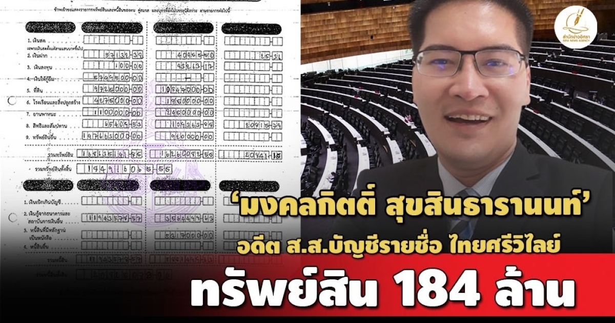 ป.ป.ช.เปิดบัญชีทรัพย์สิน 'มงคลกิตติ์ สุขสินธารานนท์' กรณีพ้นตำแหน่ง ส.ส.บัญชีรายชื่อ พรรคไทยศรีวิไลย์ ทรัพย์สินกว่า 184 ล้าน ทีมีดินและบ้านใน จ.นนทบุรี สะสมพระเครื่อง-พระทองคำ รายได้ 4.3 ล./ปี