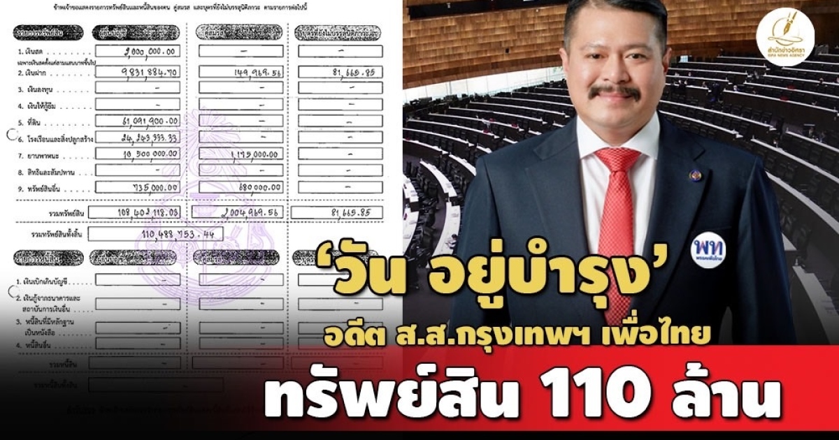 ป.ป.ช.เปิดบัญชีทรัพย์สิน 'วัน อยู่บำรุง' กรณีพ้นตำแหน่ง ส.ส.กรุงเทพฯ พรรคเพื่อไทย ทรัพย์สินกว่า 110 ล้าน มีห้องชุด 20 ห้องในสมุทรสาคร สะสมอาวุธปืน-นาฬิกา Patek