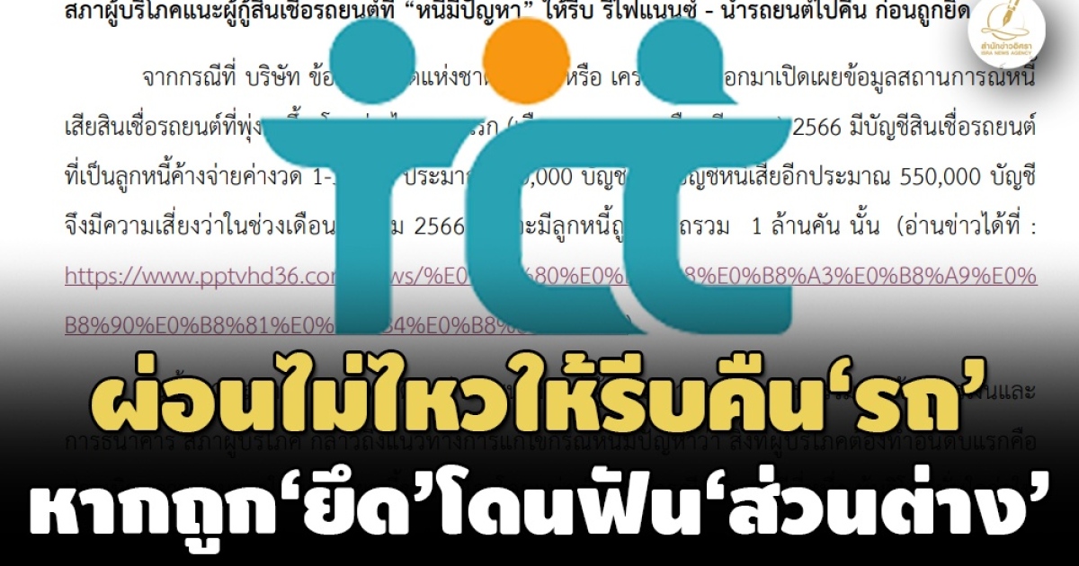 ‘สภาผู้บริโภค’ แนะ ‘ลูกหนี้’ หากผ่อนค่างวดรถยนต์ ‘ไม่ไหว’ ให้รีบนำรถไปคืน ระบุหากปล่อย ‘ไฟแนนซ์’ ยึด ต้องจ่าย ‘ค่าส่วนต่าง’ แถมจ่าย 'ค่าธรรมเนียม' เพิ่ม หากมั่นใจยังผ่อนไหวให้ปรับ 'โครงสร้างหนี้'