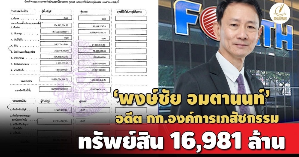 ป.ป.ช.เปิดบัญชีทรัพย์สิน 'พงษ์ชัย อมตานนท์' ประธานกรรมการบริหาร บ.ฟอร์ท คอร์ปอเรชั่น กรณีพ้นตำแหน่งกรรมการองค์การเภสัชกรรม ทรัพย์สินกว่า 1 หมื่น 6 พันล้าน มีอาคารชุด 19 หลัง บ้าน 14 หลัง รถยนต์ 11 คัน เรือ 2 ลำ เครื่องบิน 3 ลำ สะสมอาวุธปืน-แหวนเพชร รายได้ 183 ล./ปี