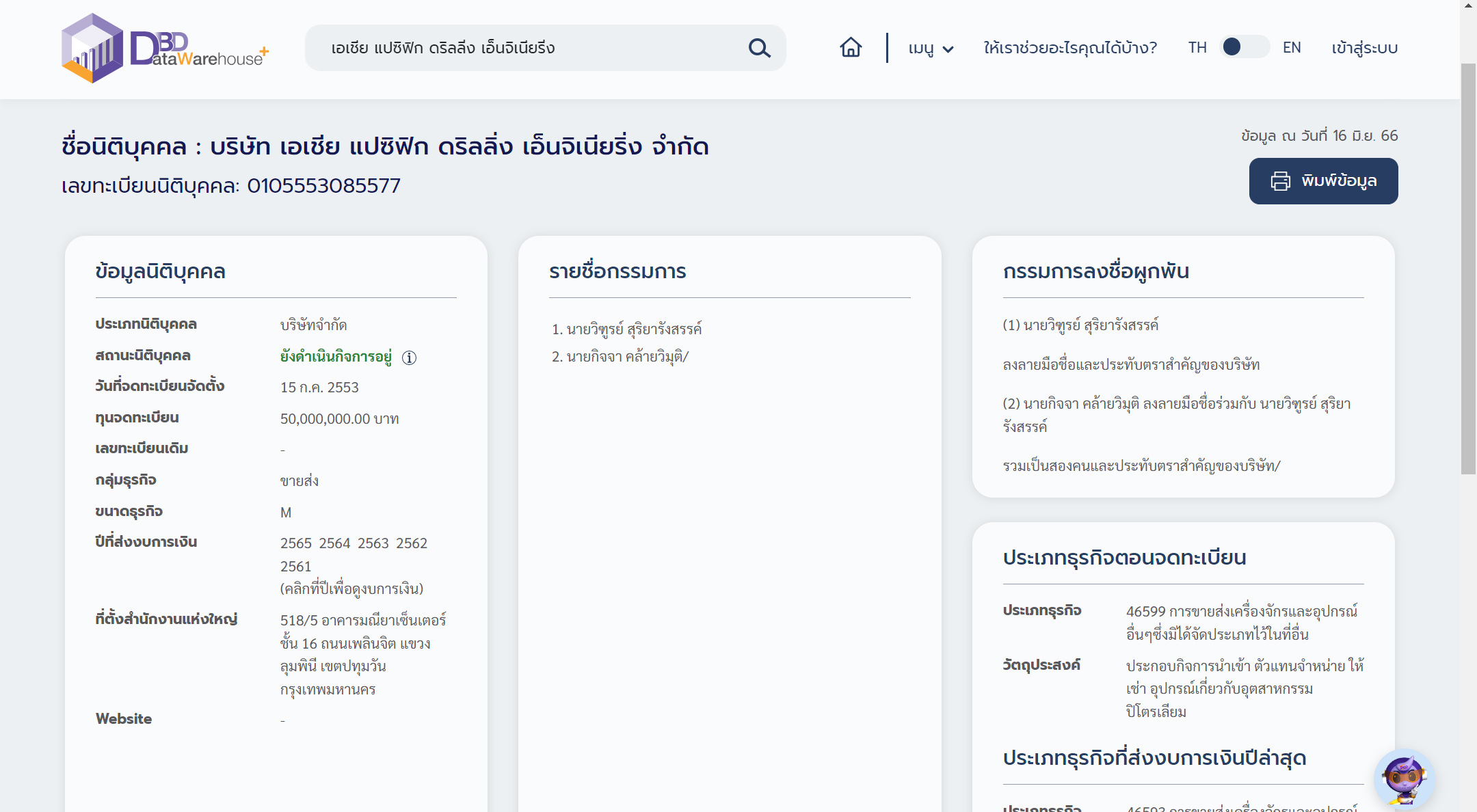 ปรากฏรายชื่อกรรมการ 2 ราย ได้แก่ นายวิฑูรย์ สุริยารังสรรค์ และนายกิจจา คล้ายวิมุติ และปรากฏรายชื่อกรรมการลงชื่อผูกพัน ได้แก่ (1) นายวิฑูรย์ สุริยารังสรรค์ ลงลายมือชื่อและประทับตราสำคัญของบริษัท และ (2) นายกิจจา คล้ายวิมุติ ลงลายมือชื่อร่วมกับ นายวิฑูรย์ สุริยารังสรรค์ รวมเป็นสองคนและประทับตราสำคัญของบริษัท