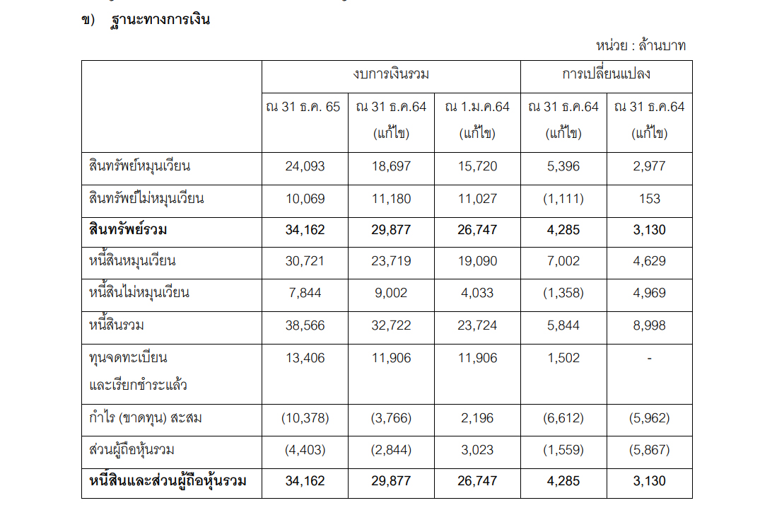 อย่างไรก็ดี สำหรับงบการเงินเฉพาะกิจการ หน้า 6 จาก 6 ปี 2565 มีส่วนผู้ถือหุ้น 2,492 ล้านบาท ลดลง 9,554 ล้านบาท เปรียบเทียบกับส่วนผู้ถือหุ้นในปี 2564 จำนวน 12,046 ล้านบาท เป็นผลมาจากการตั้งสำรองการด้อยค่าของเงินลงทุนในบริษัทย่อยและเงินให้กู้ยืมจำนวนมากในปี 2565